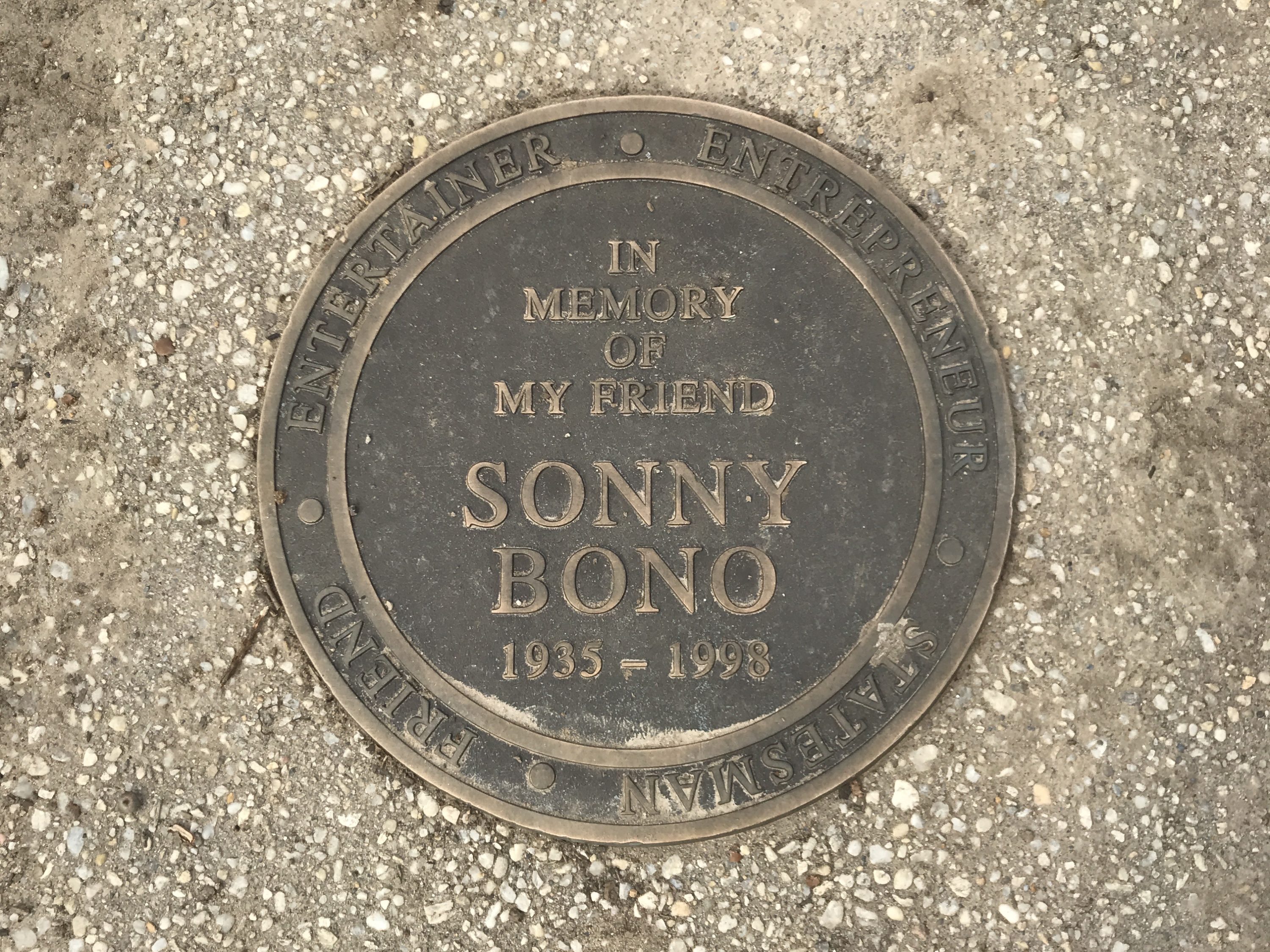 Whatever happened, Simon got to work designing an urban shrine to his friend. He says he laid down Kentucky bluegrass, planted begonias and plumes, and put in a Japanese maple from Bono’s 44th district. He installed underground sprinklers and single seat concrete benches (“[DPR] told me not to build anything big enough for someone to sleep on,” says Simon). Then, he buried a time capsule-like container holding a few Sonny-inspired items: a menu and mug from Bono’s restaurant, Congressional cufflinks that the congressman gave Simon as a Christmas present, and a copy of sheet music of “The Beat Goes On.” On top of this container, he installed a bronze, manhole-shaped plaque that still reads, “In Memory of My Friend Sonny Bono 1935-1998.” Simon estimates that he poured tens of thousands of dollars of his own money into the project.