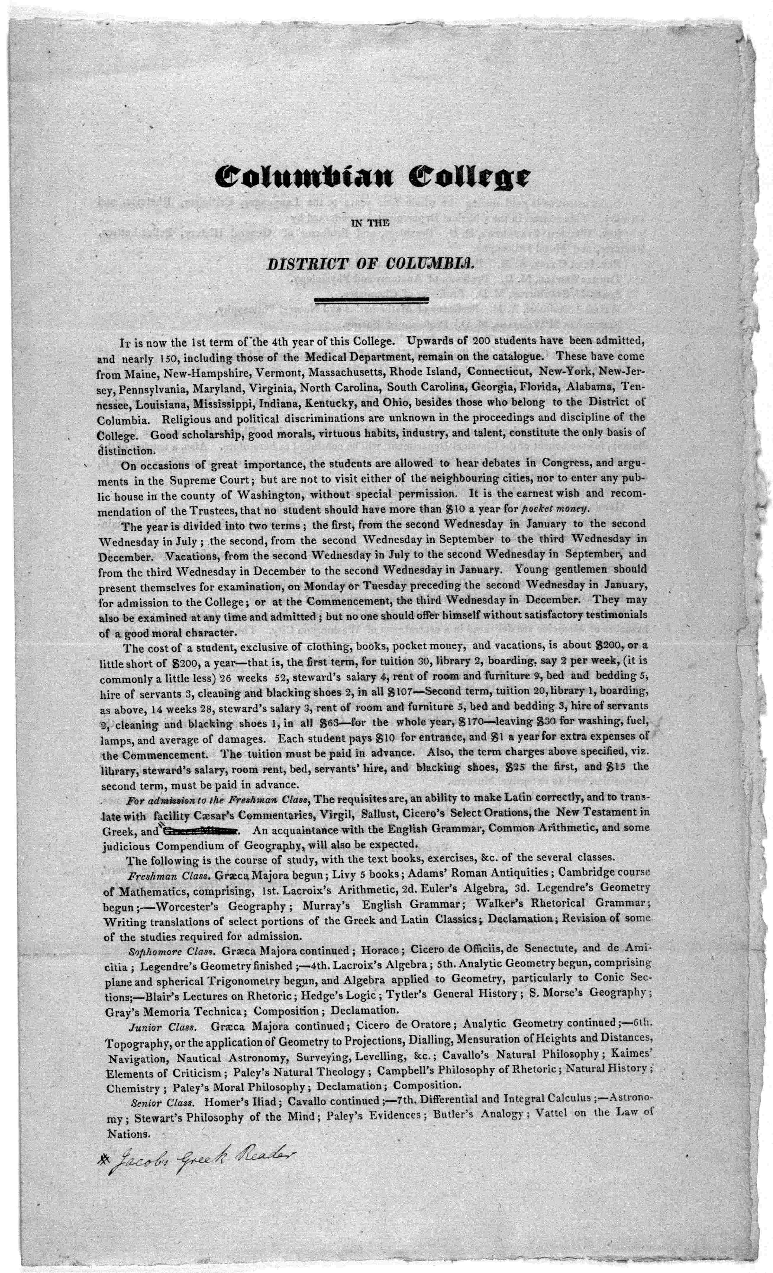 In 1821, a group of trustees fulfilled George Washington’s long-time dream of founding a national university in D.C. Columbian College opened its doors on College Hill between 14th and 15th streets in modern-day Columbia Heights. The original admittance requirements included literacy in Latin, being able to translate Caesar’s Commentaries and the New Testament in Greek, and “a thorough knowledge of geography.” (Plus being male and white.) The first classes paid $60 annually in tuition. Classes rolled along until the Civil War, when the U.S. government commandeered the campus on the hill and Columbian medical graduates served on opposite sides (46 Union, 24 Confederate). In 1904, the college changed its name to The George Washington University and within a few years began its move to present-day location in Foggy Bottom.