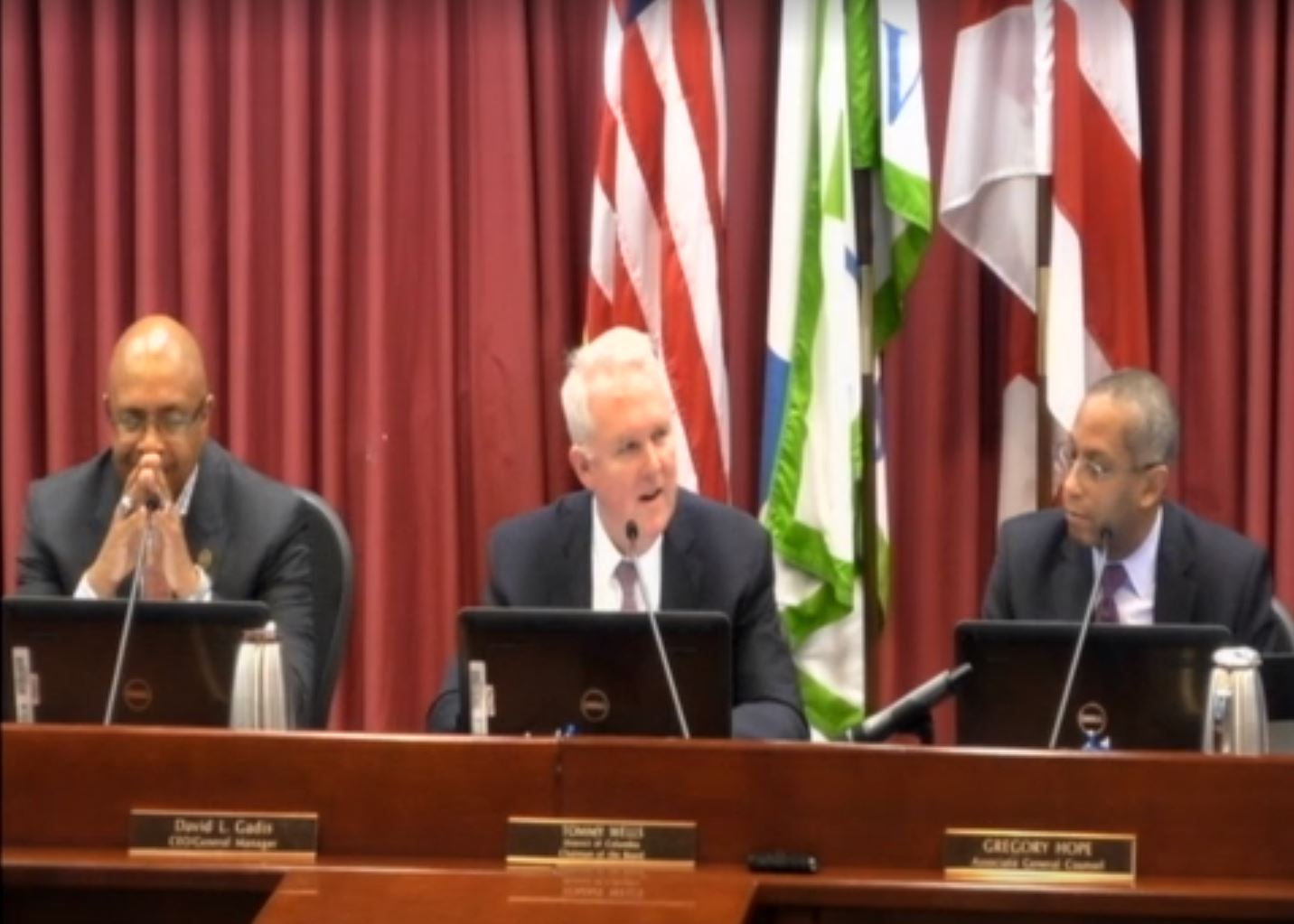 Tommy Wells, chairman of the DC Water board of directors (center), during the January 3 meeting.DC Water