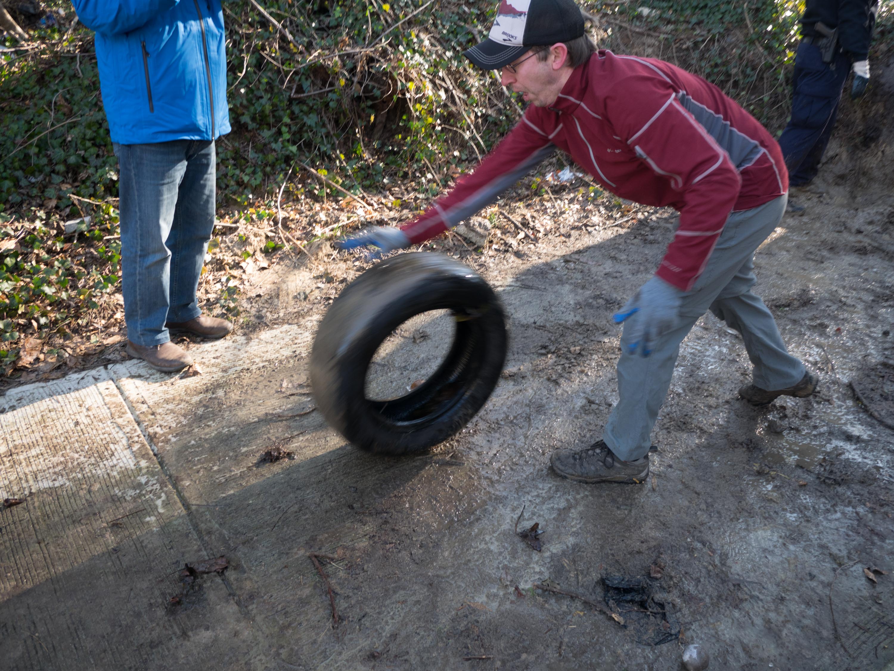 As volunteers continued to roll tires down the hill, Lawson eyed the growing stacks of them. “We obviously misjudged the size of the dumpster we would need to remove them,” she says.