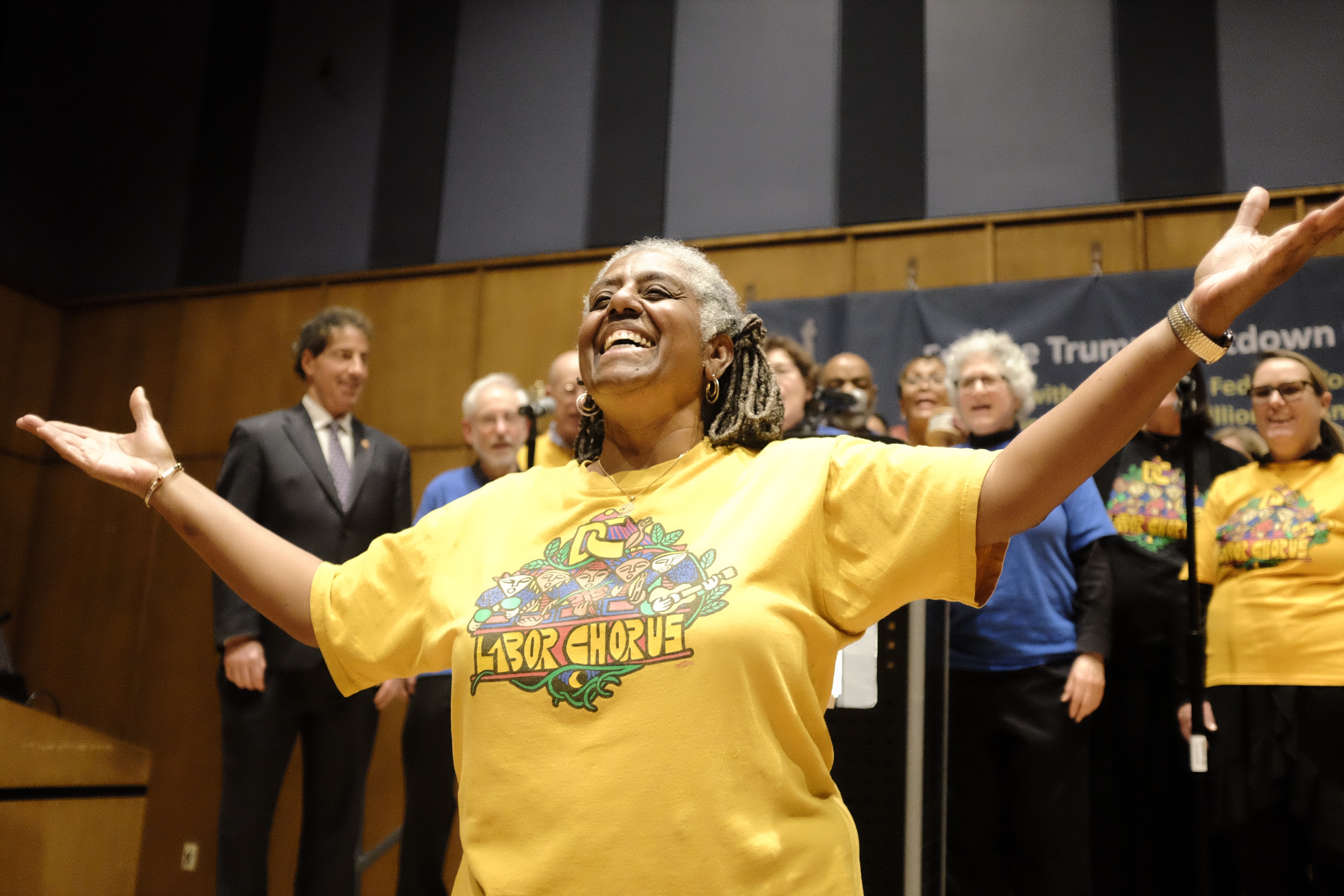 A singer with the D.C. Labor Chorus leads a rendition of “This Land is Your Land” during a rally for federal workers in Silver Spring, Maryland.Patrick Madden / WAMU