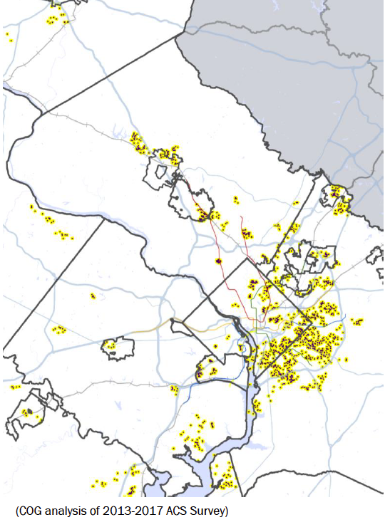 Analyzing data from the Census’ American Community Survey, MWCOG drilled down on where the lowest-income federal workers live. For the most part, their geographic distribution mirrors overall income distribution in the region: wealth is generally concentrated in the region’s western districts.