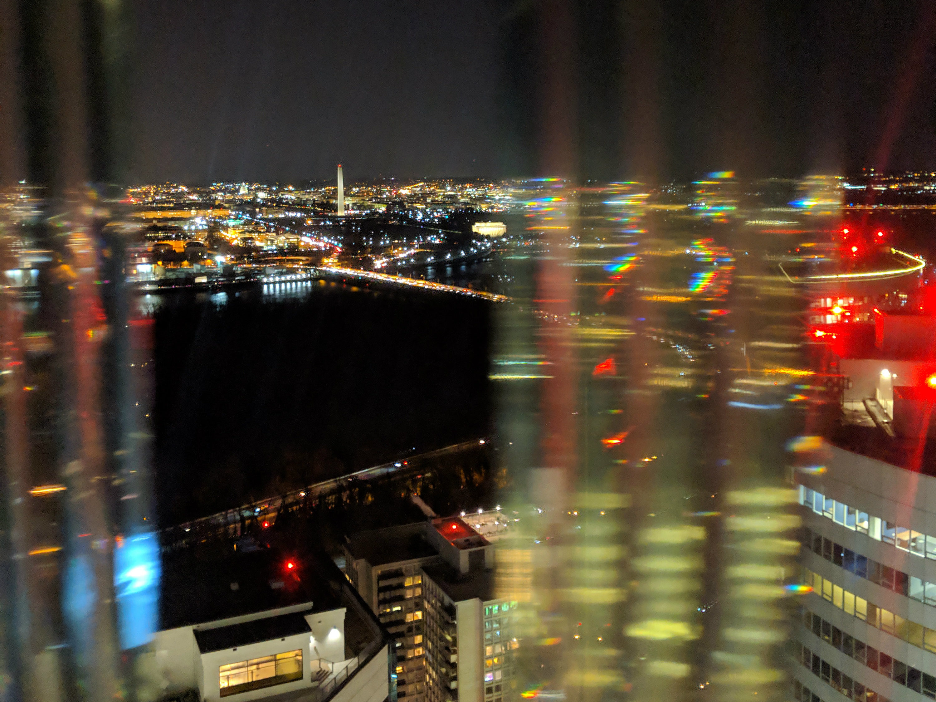 - It’s surprisingly difficult to take photos of the twinkling skyline with panes of super-thick glass in the windows. No matter how close you get to the window, you’re doomed to capture some of your own reflection in the photo. I didn’t come all the way to Rosslyn to take a selfie!