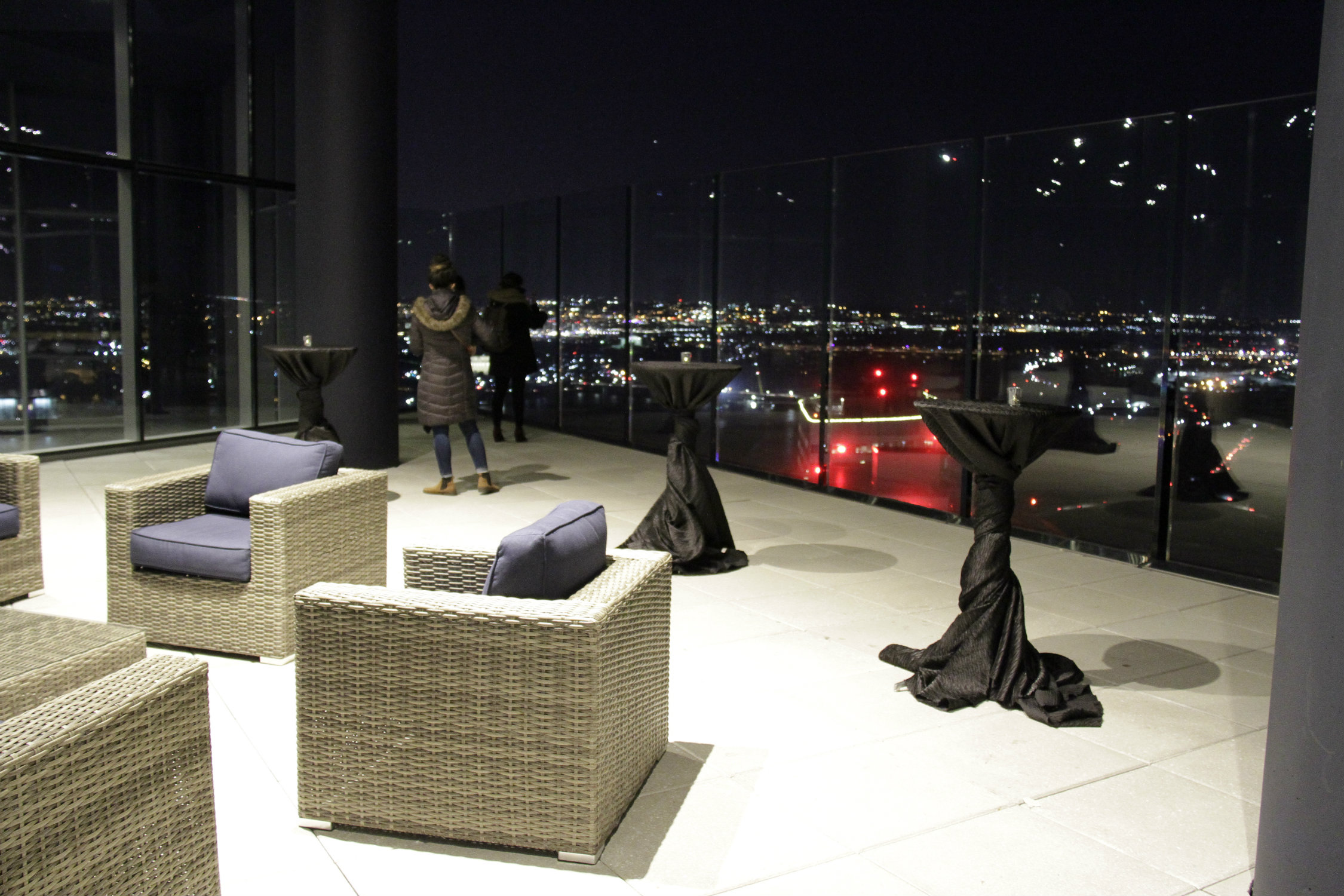 - Aside from the elevator (which, by the way, would have been a VERY fun ride—I’m thinking Tower of Terror, Rosslyn-style), my favorite part was the outdoor deck. The traffic looks so quaint from 31 stories up! Everything does, really. On a warmer day, it might be nice to lounge on some of the outdoor furniture and take in the view. On a cold night, with most of the land swathed in darkness, I didn’t feel the need to linger for too long.