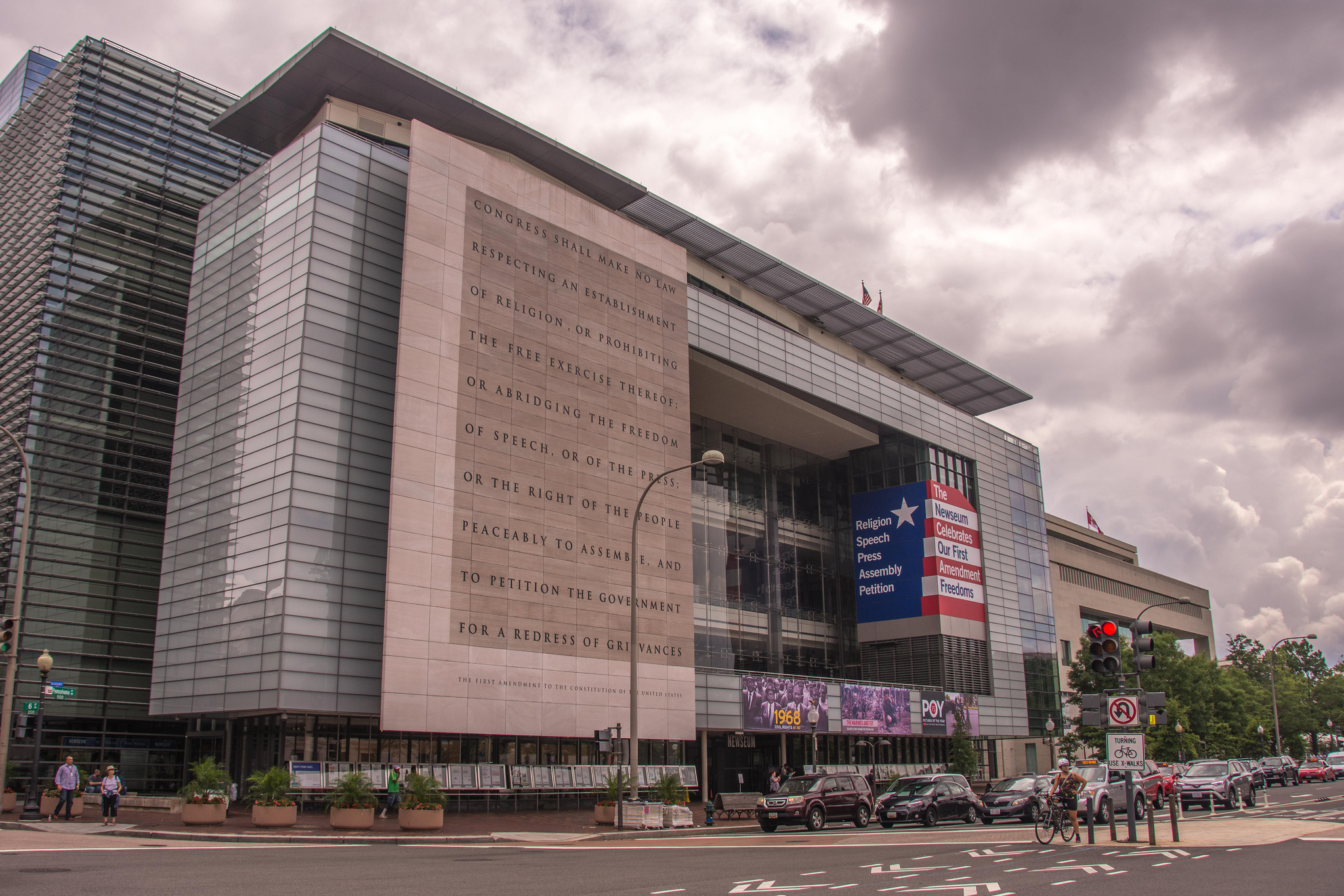 The First Amendment-focused Newseum moved to its resplendent Pennsylvania Avenue location in 2008. The seven-story building features a 74-foot-high marble engraving of the First Amendment, a terrace with soaring views of the U.S. Capitol, and street-level displays of newspapers from every state.