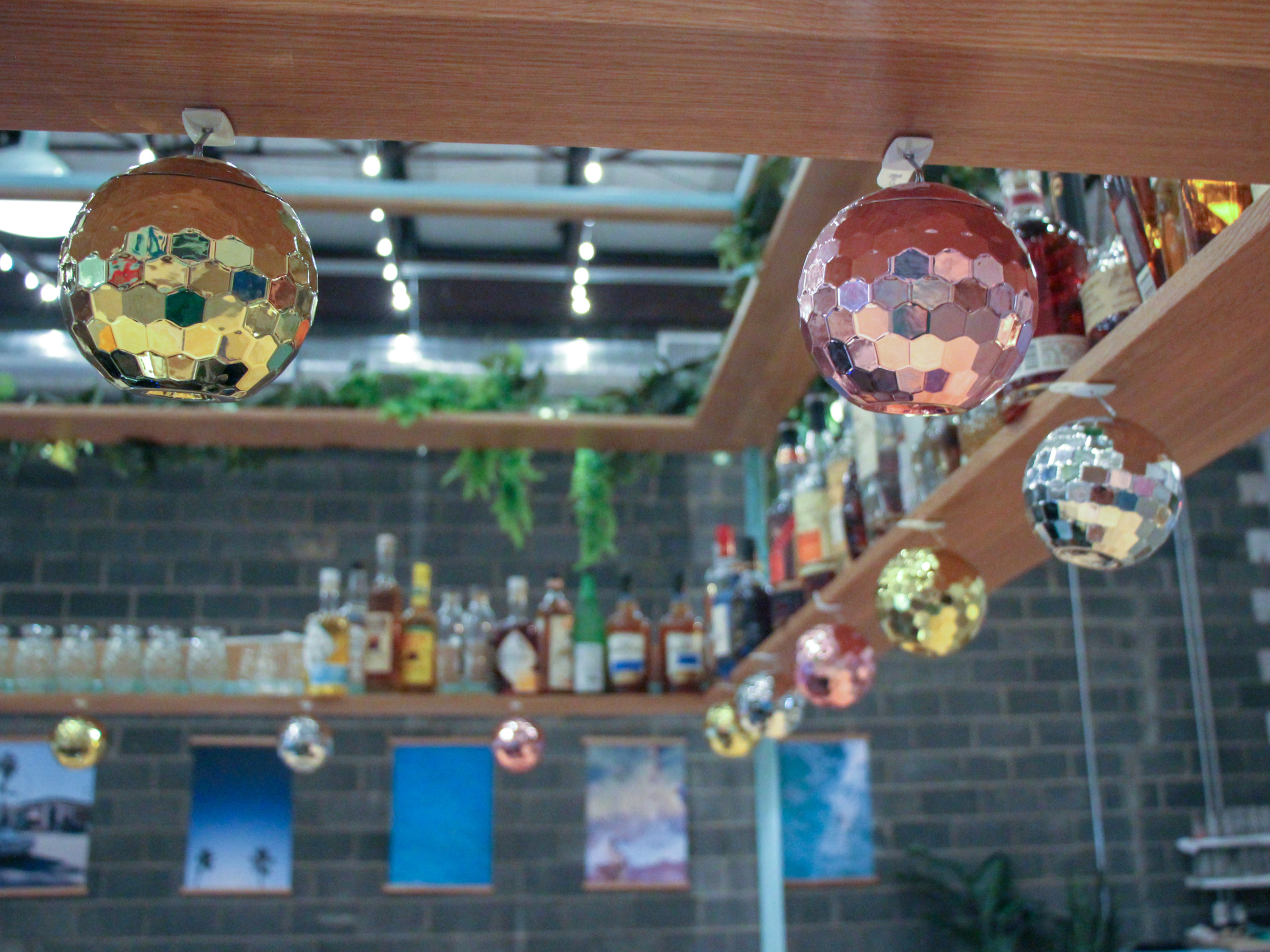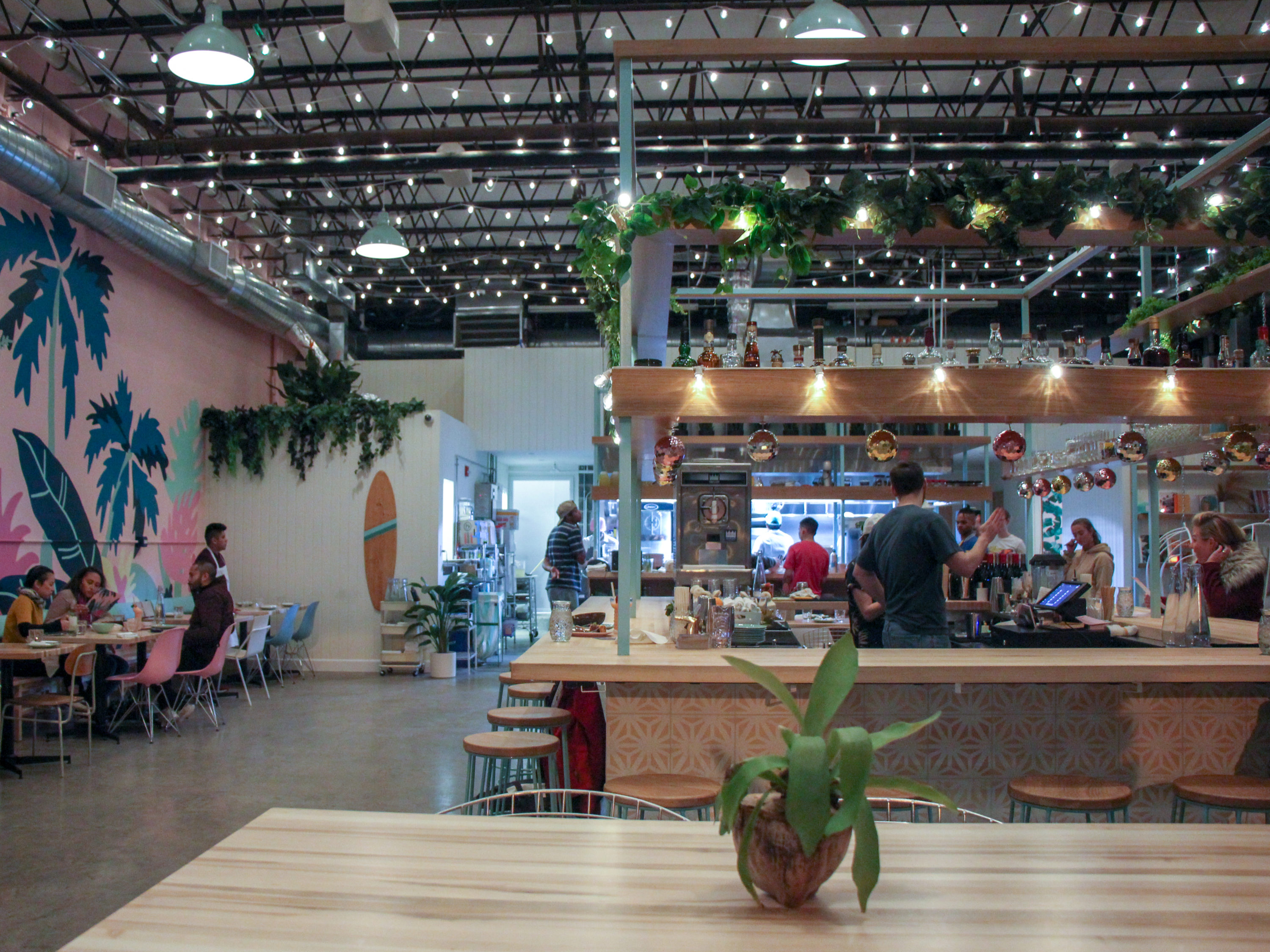 Located in an electric building’s former loading docks near Union Market, Coconut Club has no shortage of photo ops. A vast ceiling is strung end to end with twinkling lights; a blue and baby pink mural adorned in palm fronds by local artist Meg Biram envelopes one wall; disco balls line the bar’s edge; and hanging basket chairs outfit a reading nook.