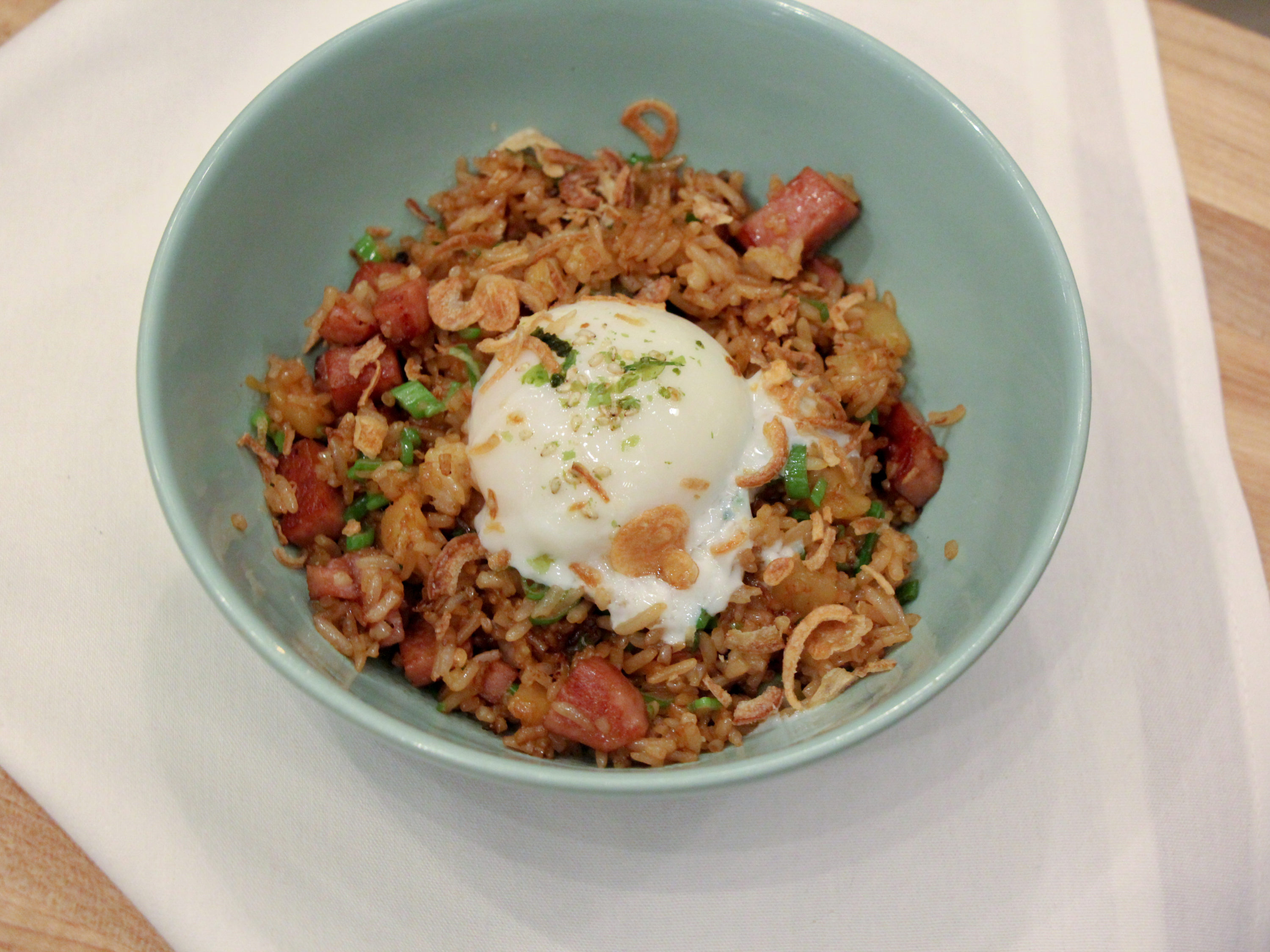 Tuna and salmon poke are served with lotus root chips, black walnut vinaigrette is drizzled into a coconut and butternut squash salad, and crispy brussels sprouts top yuzu-coconut yogurt and pickled carrots. Seafood options include kimchi butter clams, oysters on the half shell, fish tacos, and calamari with a citrus chimichurri. Spam, another Hawaiian favorite, flavors a patty melt, fried rice served with a runny egg and charred pineapple, and the bourbon for the restaurant’s namesake old fashioned.