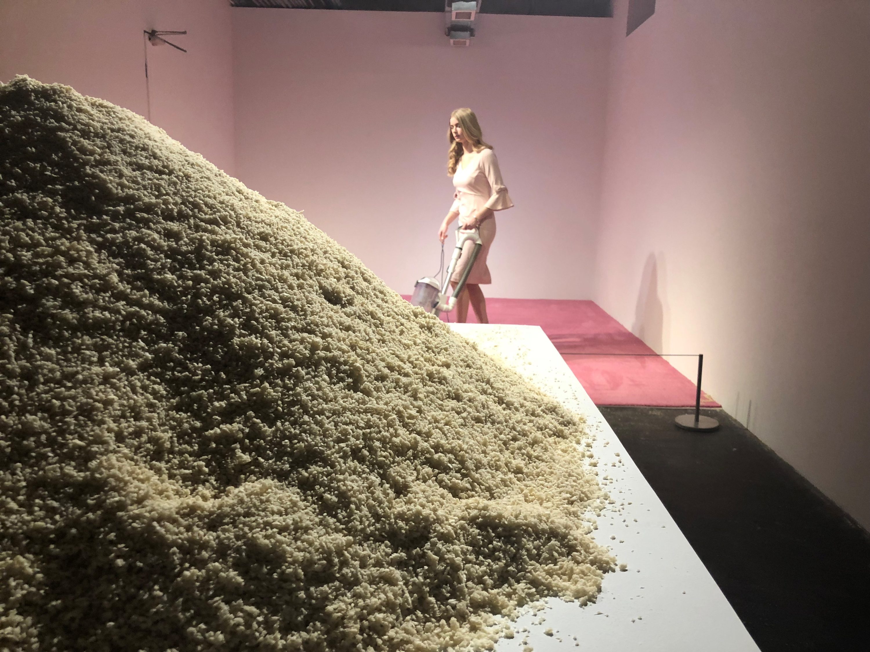 In Jennifer Rubell’s performance art piece “Ivanka Vacuuming,” Rubell gives gallery-goers the necessary ingredients for a dust-up: an Ivanka Trump look-alike in inches-high heels vacuums a pink carpet covered in crumbs. Mere feet away, a huge mound of crumbs sits atop a pedestal, and people are encouraged to take a fistfull and throw them at the ersatz First Daughter. The exhibition text describes the piece as a “visual celebration of a contemporary feminine icon; a portrait of our own relationship to that figure; and a questioning of our complicity in her role-playing.”