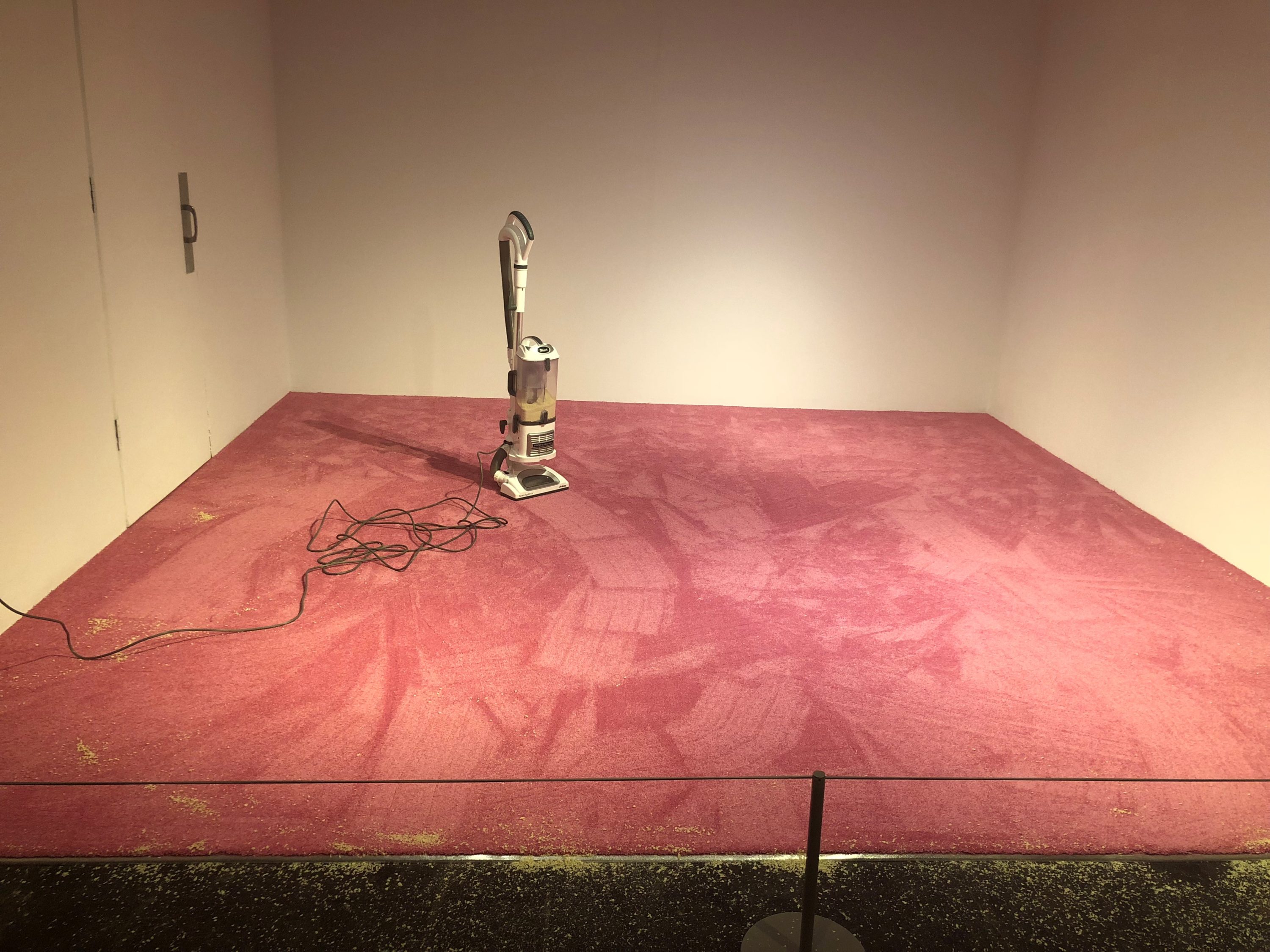 On Friday evening at Flashpoint Gallery, opening night for the piece’s debut, most of the dozens of attendees opted not to throw the crumbs (I did see one person eat some of them, though). Instead, most milled around, chatting with one another and watching the faux-Ivanka slowly, silently vacuum as the rouge-colored carpet picked up the geometric pattern of the domestic tool’s path.