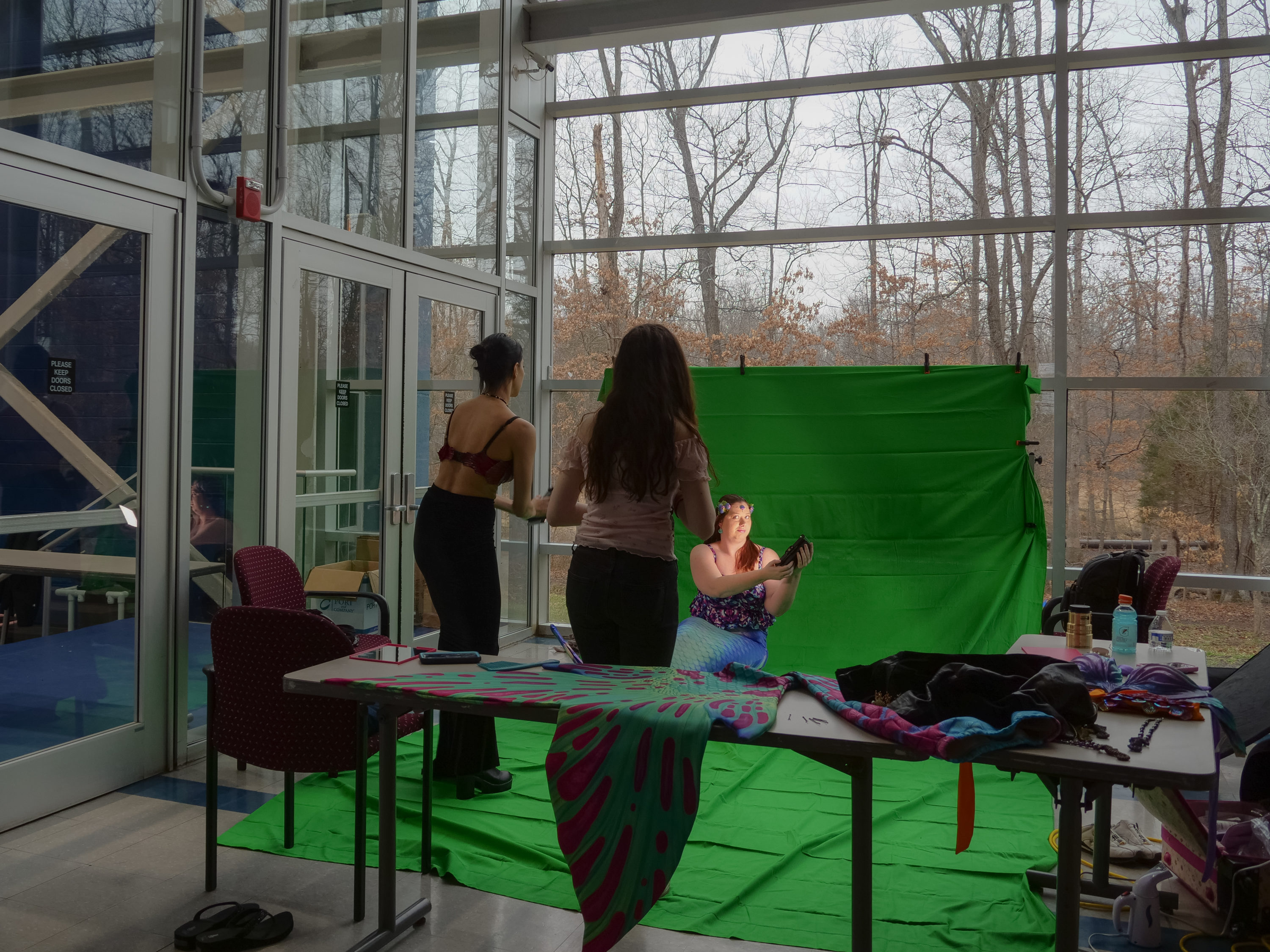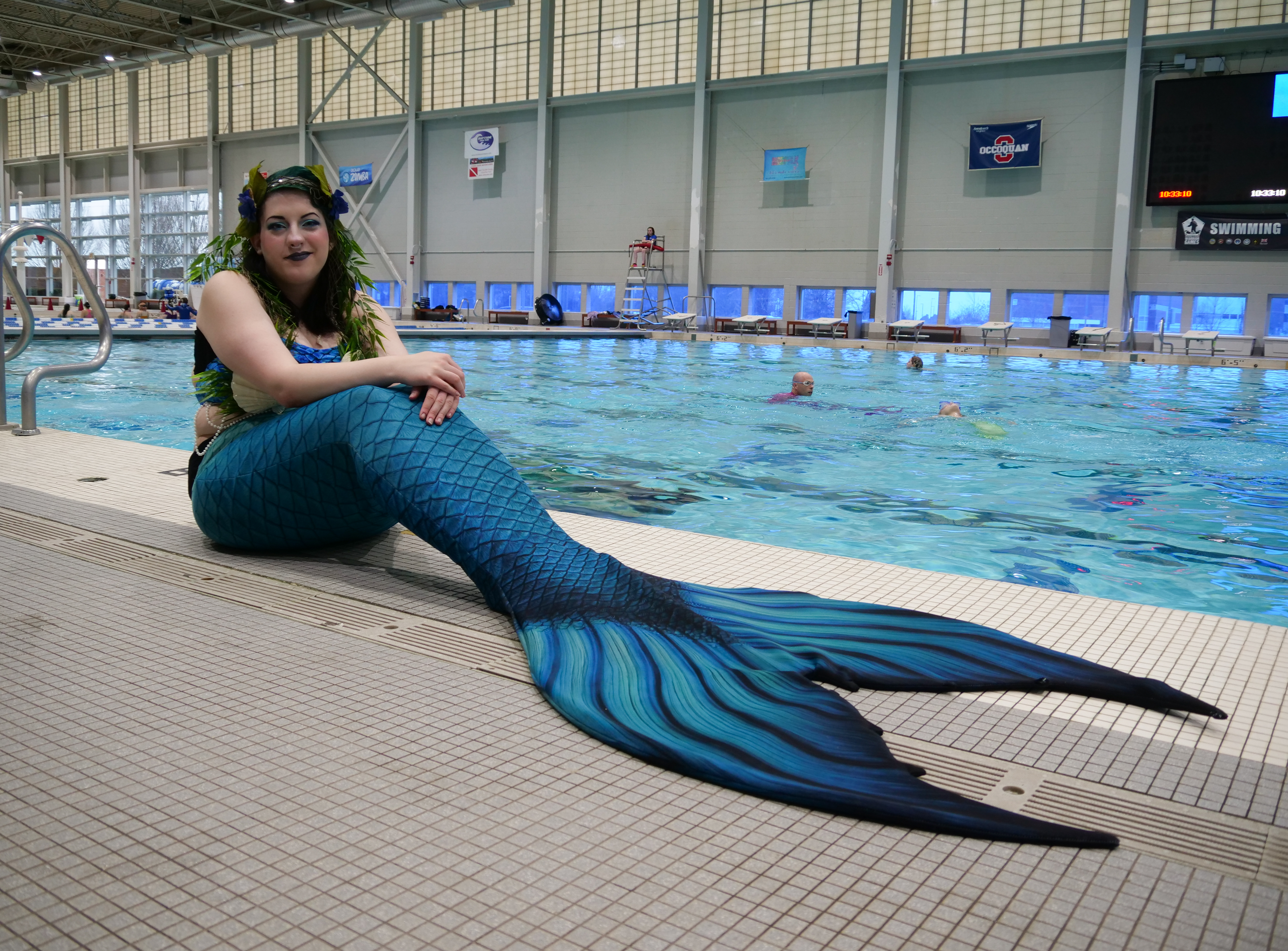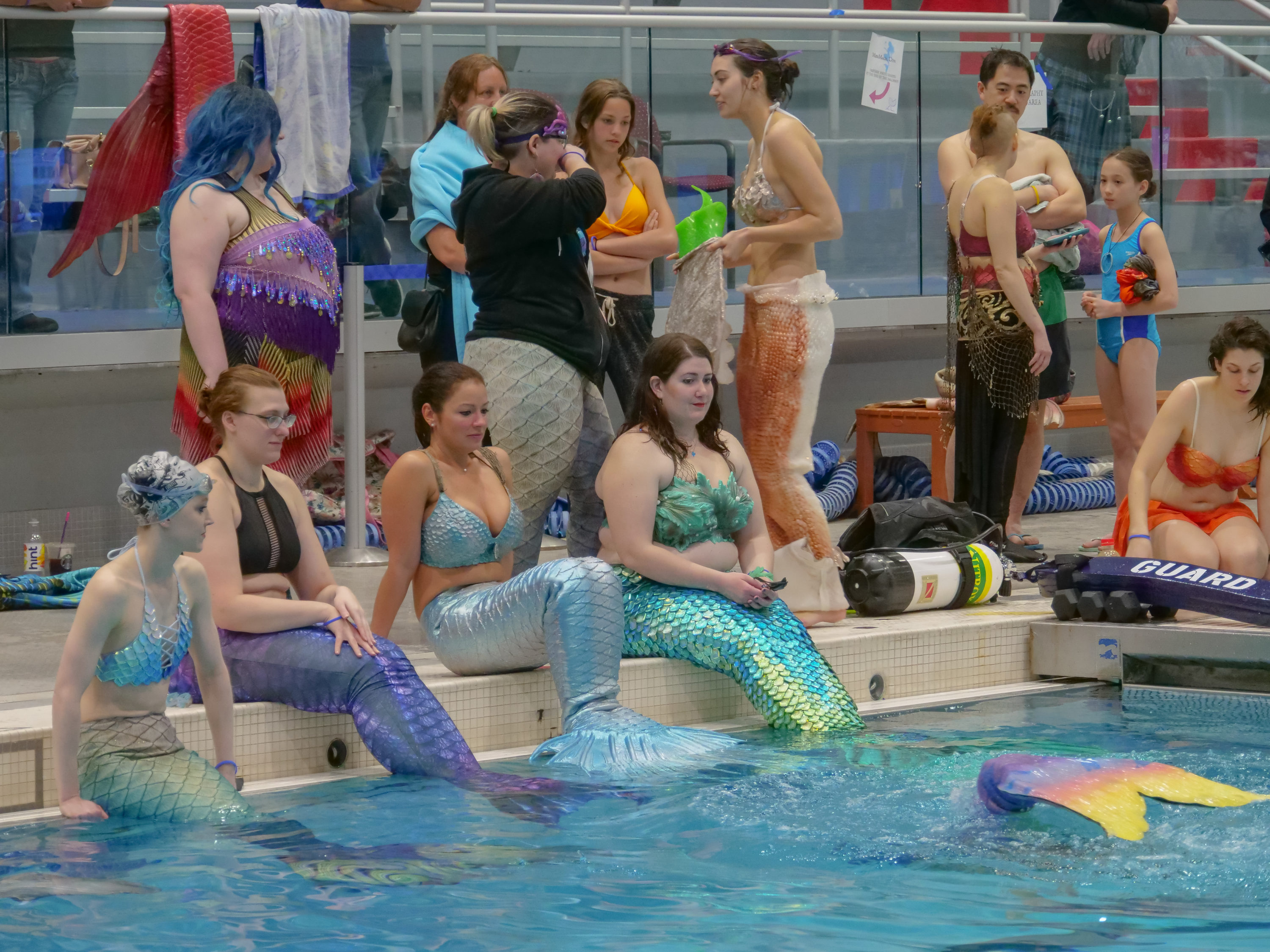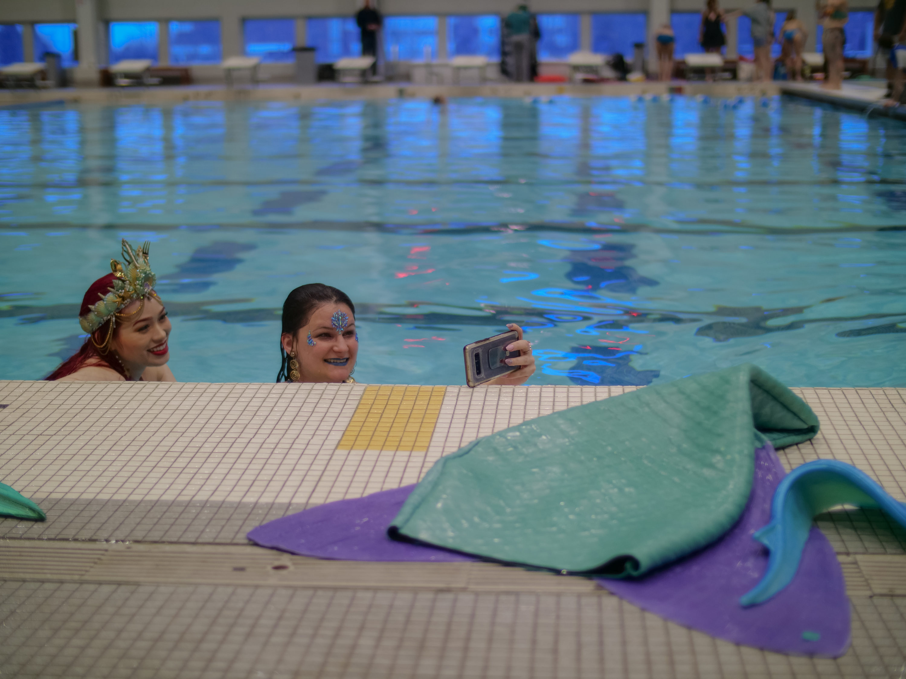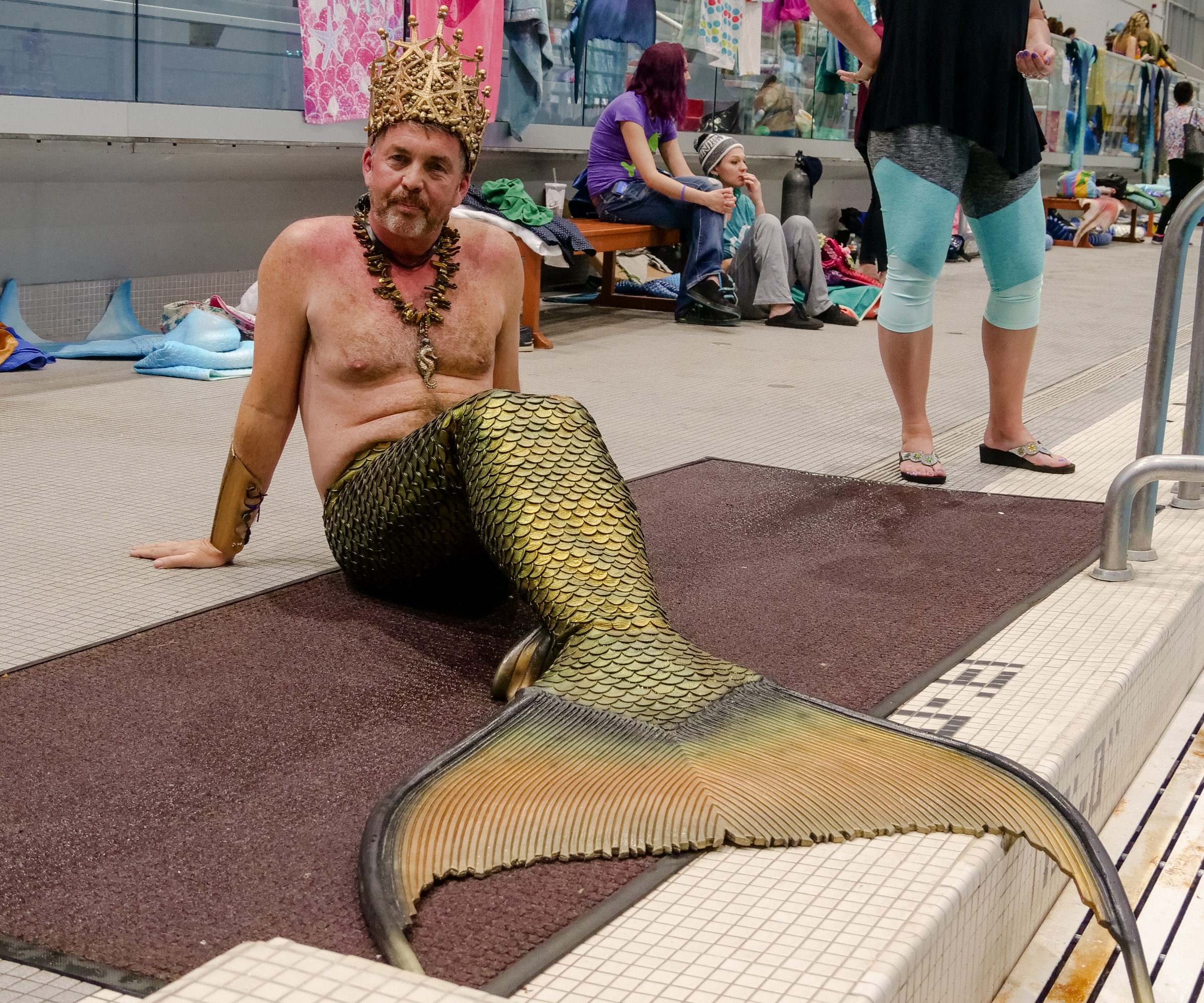 8:15 a.m.: I arrive at the venue, which is a big rec center. The mermaids have rented out the pool and a few of the classrooms, but there are people running on the treadmill and doing step aerobics classes in other rooms. I wonder what they think of all this. I wonder if step aerobics is “feetist” to people with fins. A few mermaids are lounging around the pool already. Others are still getting their tails on.