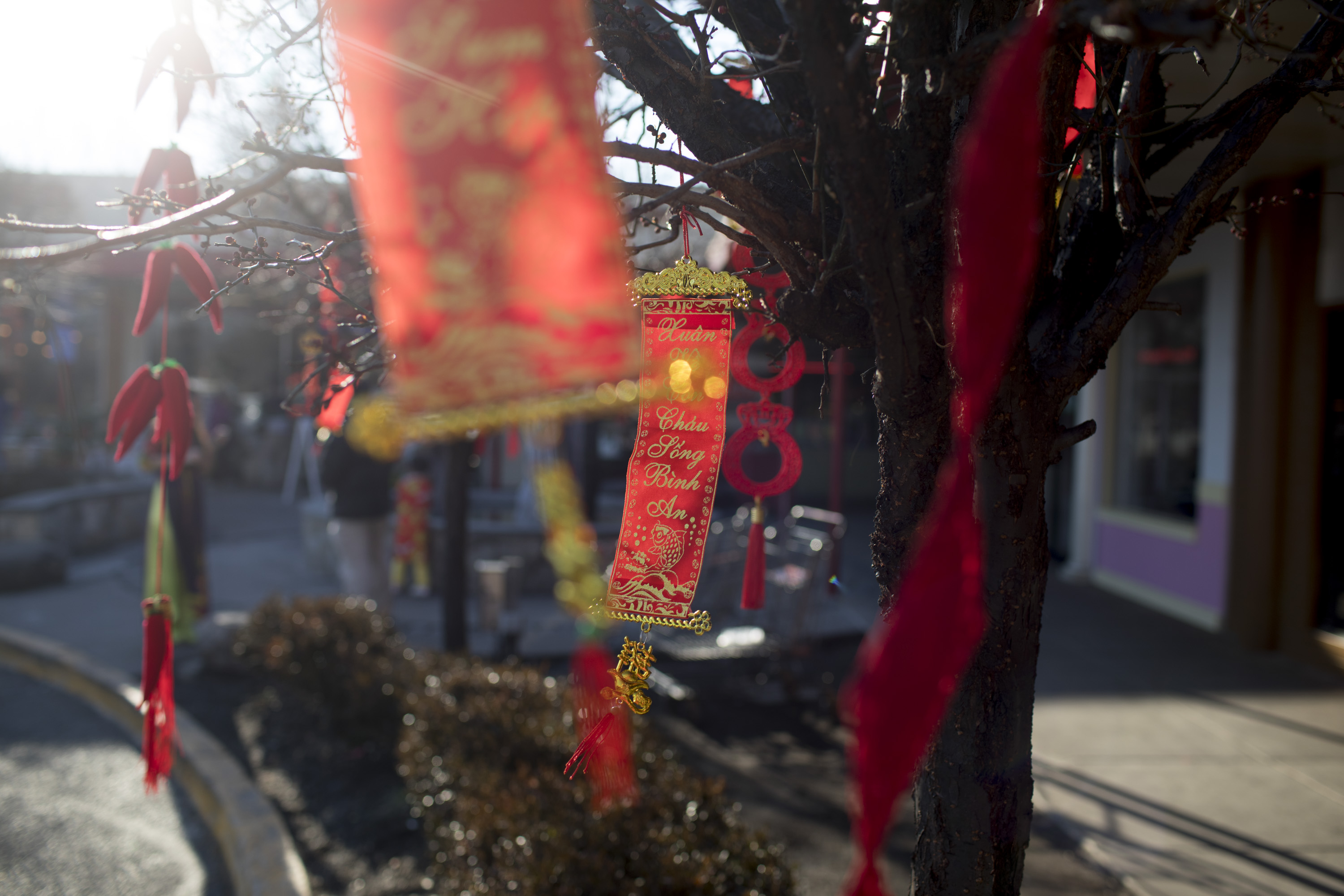 At Huong Binh Bakery, 87-year old Anh Le sits at the counter putting the finishing touches on handmade pink pork rolls. His son Quang takes stock of popular holiday items like Bánh chưng and Mứt dừa, making sure there’s enough for the tide of customers about to roll in. Behind the clock tower and just inside of the mall, Vicki Tu of Dupont Central Jewelry helps a customer decide on the perfect bracelet to give as a new year’s gift. Her husband David, glasses slipping down his nose, watches as a worker chisels away on a ring. All around the roughly 120-store, 200,000 square foot shopping plaza, the words Chúc mừng năm mới reverberate through the air as preparations are underway for the Year of the Pig.