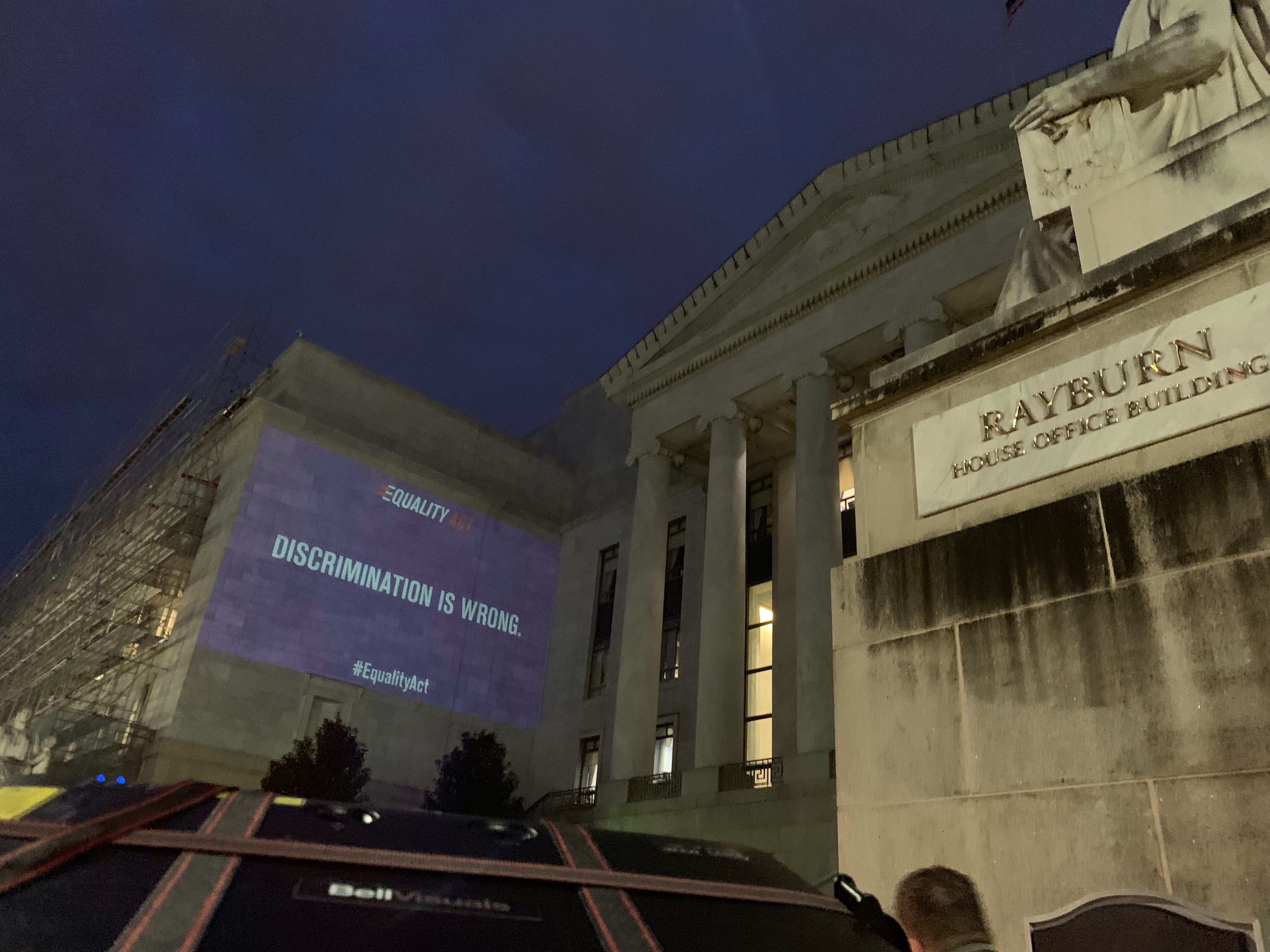 Bell told WAMU Wednesday night was the third time they had projected messages onto the Rayburn House Office Building. This time, Bell said, they were projecting the words “Discrimination is Wrong.”