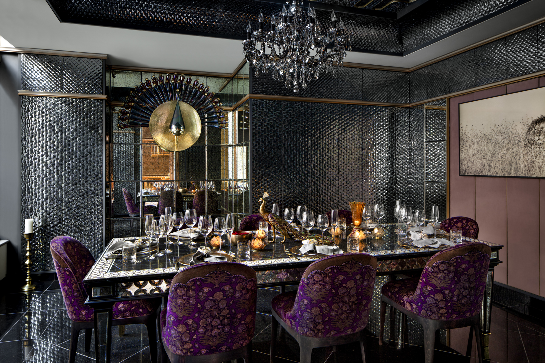 The “crown jewel,” as Singh calls it, is the sheesh mahal private dining room, a lavish hideaway decorated in 150,000 tiny mirrors and upholstered chairs and drapes with fabric customized by the designer Peter D’Ascoli. The room is available to rent for up to 10 people for upwards of $2,000.