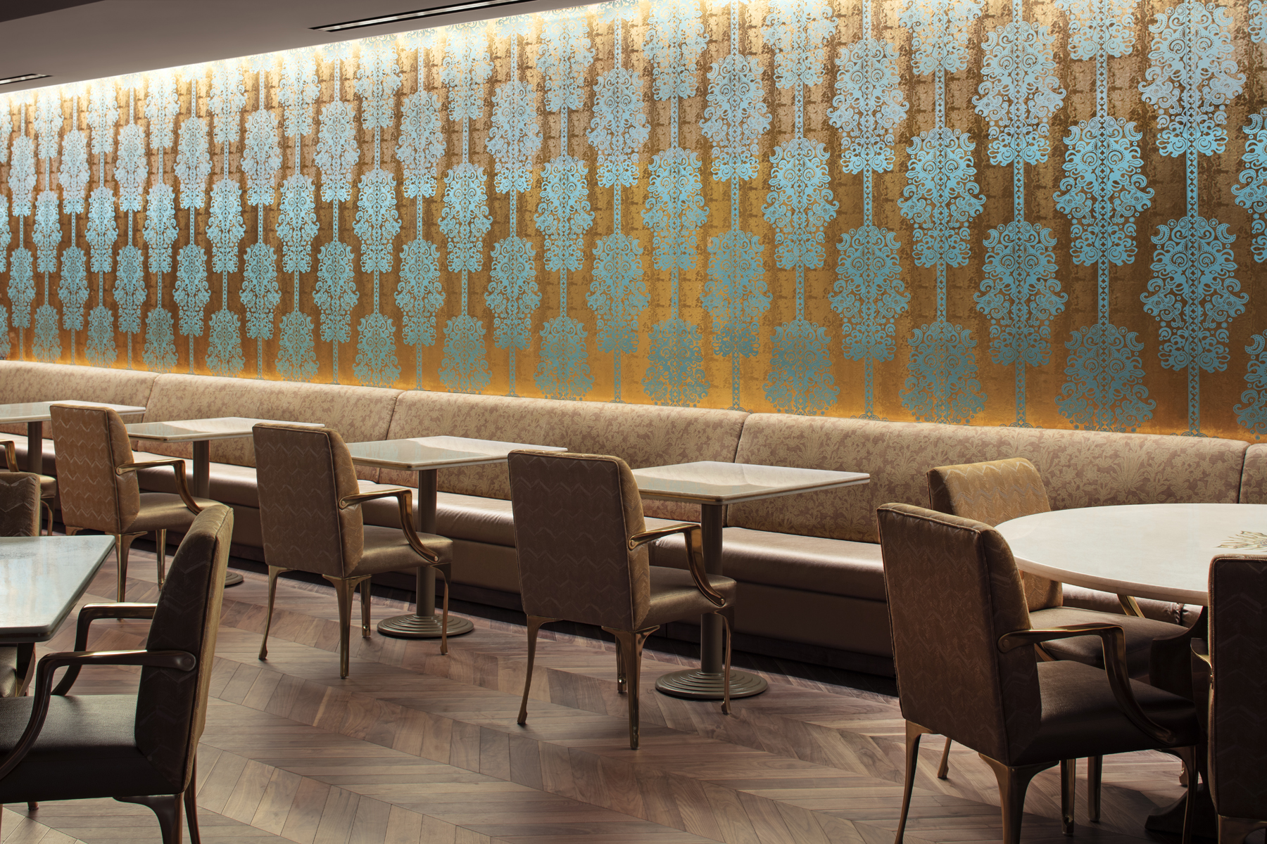 In the Passage to India room, booths take after railway cars of the Golden Age, with 200-pound marble legs. Even a detail as subtle as the tables’ edges has not been forgotten, each one in the “living room” section lined by brass.