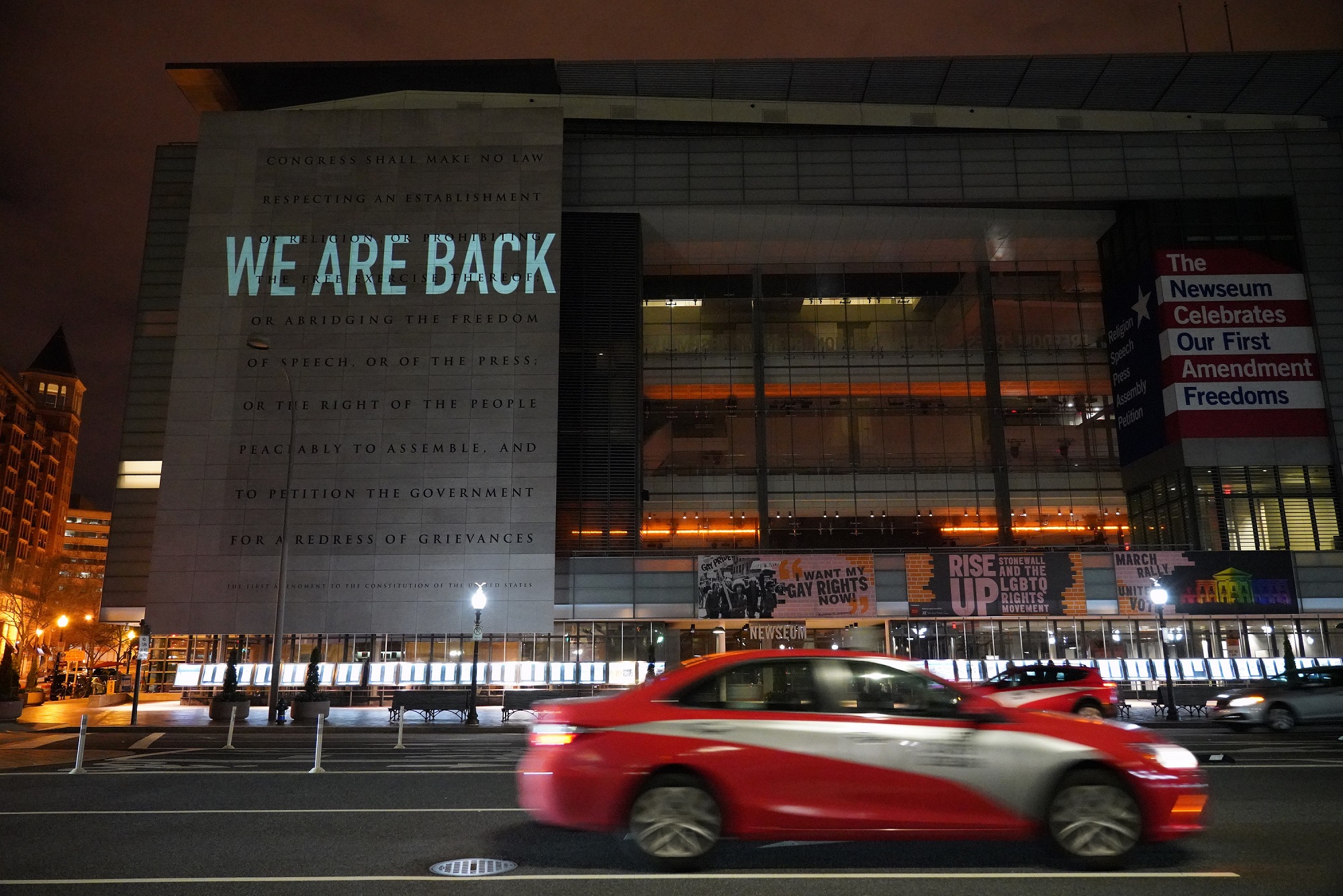 Last night, Bell was already back at it, doing several projections on the front wall of the Newseum.