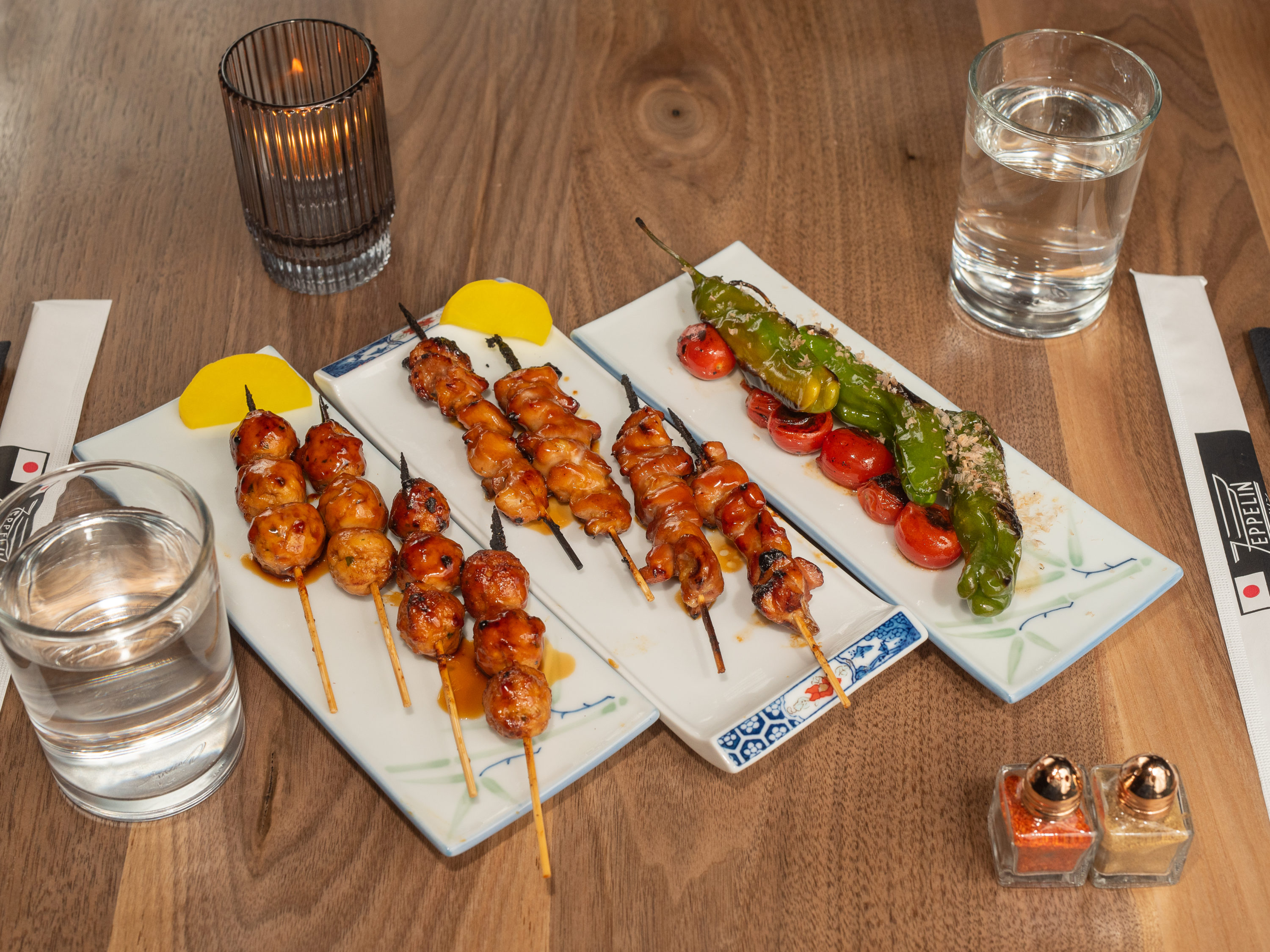 Highly recommended: Snag one of the six scarce standing table spots to eat in the kitchen, where chefs prepare yakitori—meat and vegetable skewers. The nearly two dozen options run $3-$15, and include waygu beef, kalbi (beef short rib), sunagimo (chicken gizzard), ebi shumai (shrimp dumpling), and kawa (chicken skin), and other items. Zeppelin’s menu also includes traditional Japanese appetizers, such as tempura, edamame, seaweed salad, and takoyaki. Larger dishes include donburi ($12-$22).