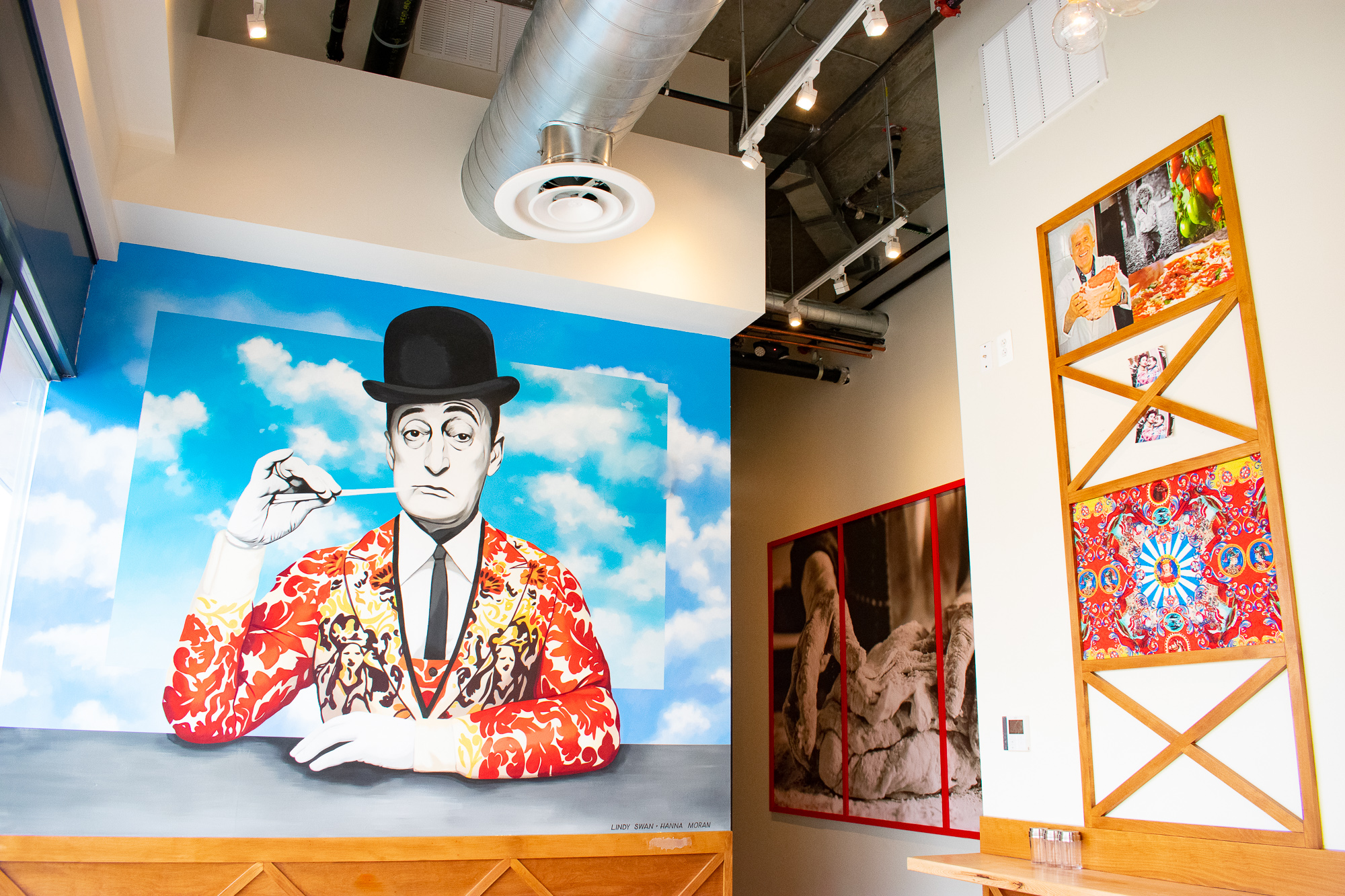 The pizzeria’s aesthetic combines tradition with a modern twist. For example, a large painting in the back shows the late Totò donning a modern Dolce & Gabbana jacket. Yellow, green, and blue accents in the art and tiles are a nod to the southern Italian coastline. Red and white accents throughout the restaurant represent the colors you’ll typically find at pizzerias in Naples, Matarazzo says.