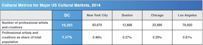 Despite these seemingly low numbers, the report says that D.C. residents are three times more likely to be professional artists than New Yorkers and six times more likely than Chicagoans on a per capita basis.