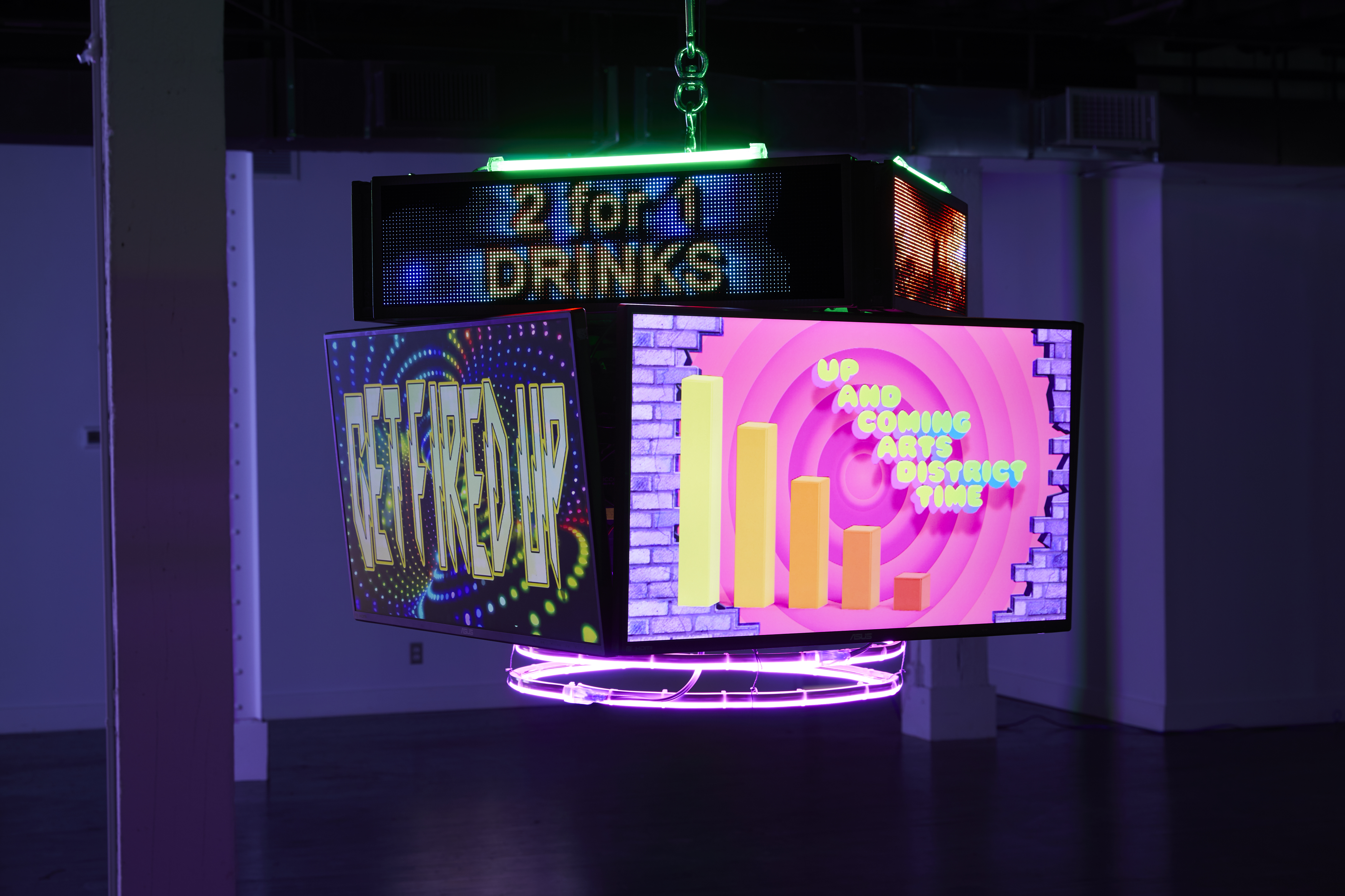 The 10 multi-channel video installations and animated pieces in the exhibit include neon multimedia assemblages, hanging LED screens with animated text messages about mental health, and sculptural video.