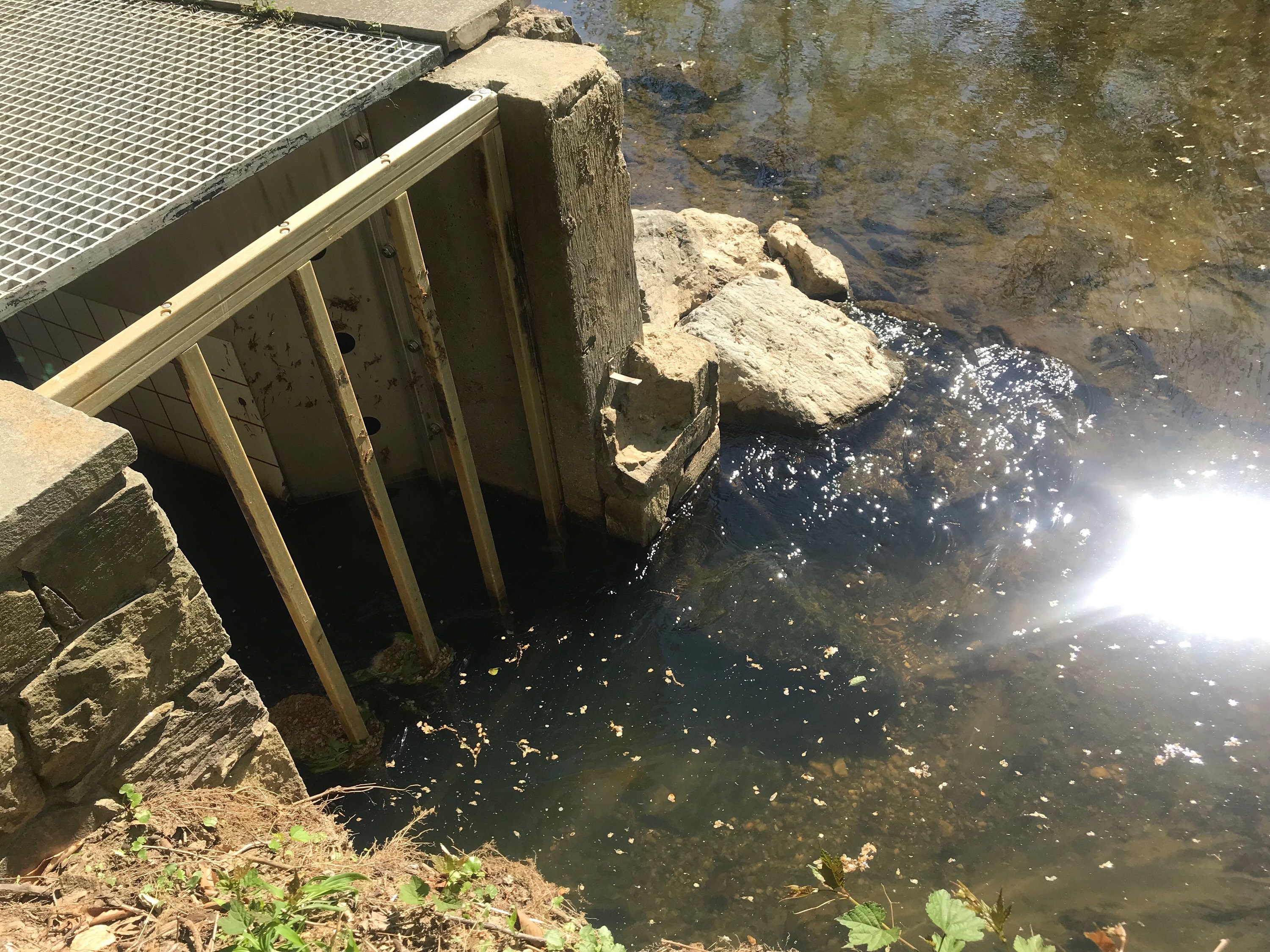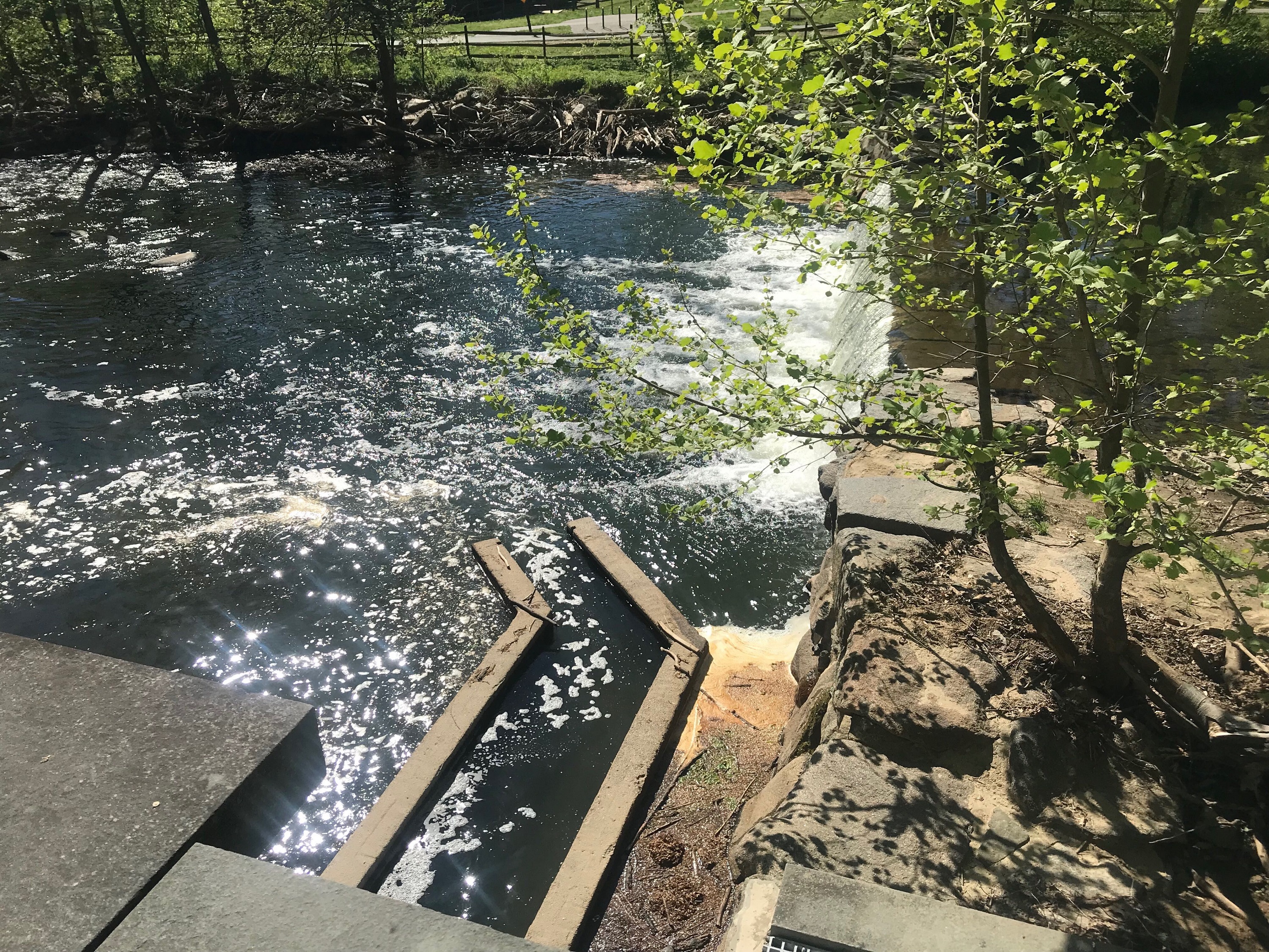 Without a trained eye, you might miss the structure altogether. Looking into the creek from Peirce Mill, it’s on the far side of the dam, and appears at first like a swimmy little sidewalk for fish. If the conditions are right (the current has to be strong enough to attract fish who want to swim upstream), river herring can swim up this little sidewalk and then into the “ladder,” where the current looks downright harrowing. The fish are meant to swim against the current one step at a time, eventually coming out on the other side of a grate and (voila) into a vast expanse of suitable spawning ground.