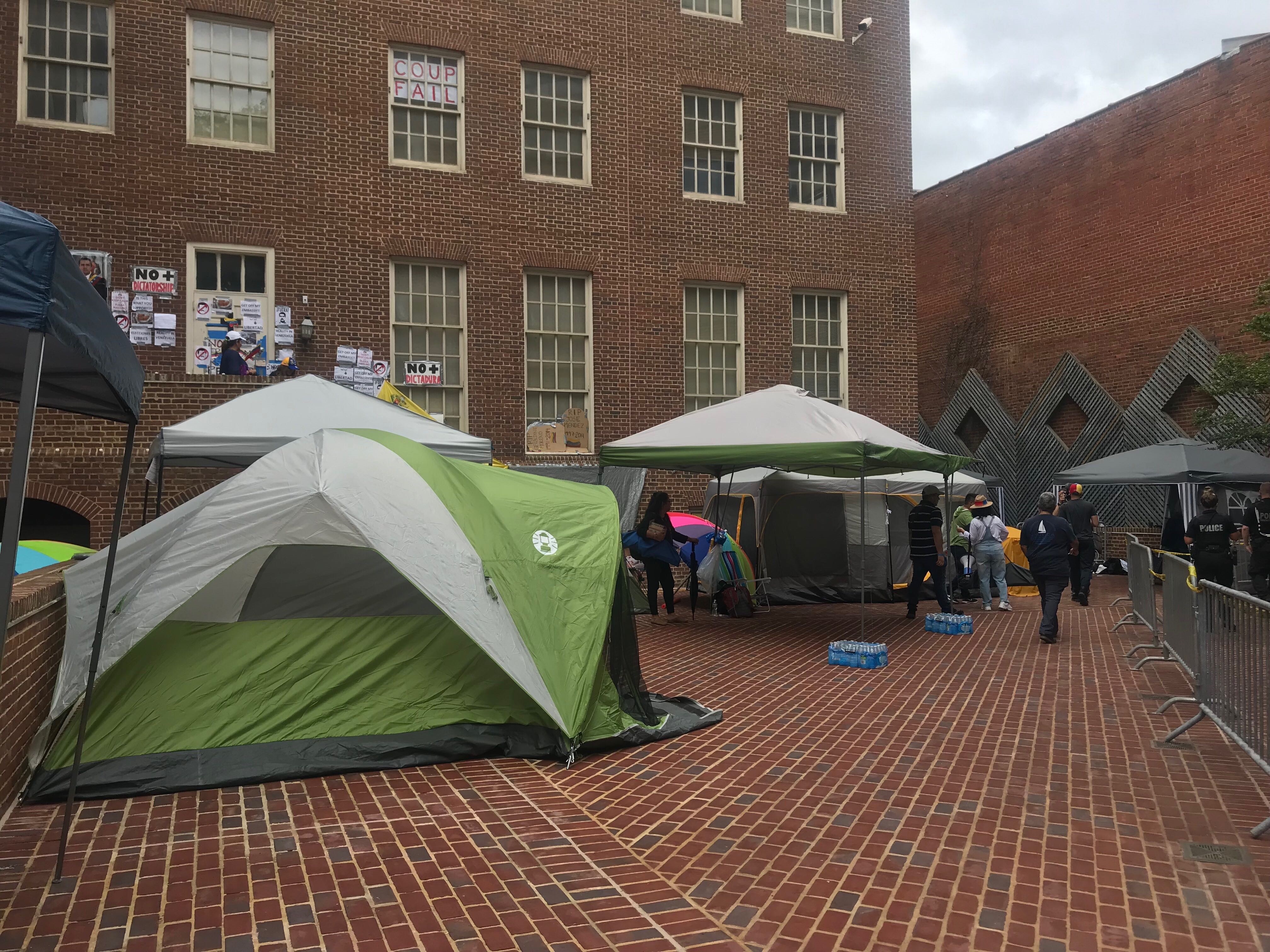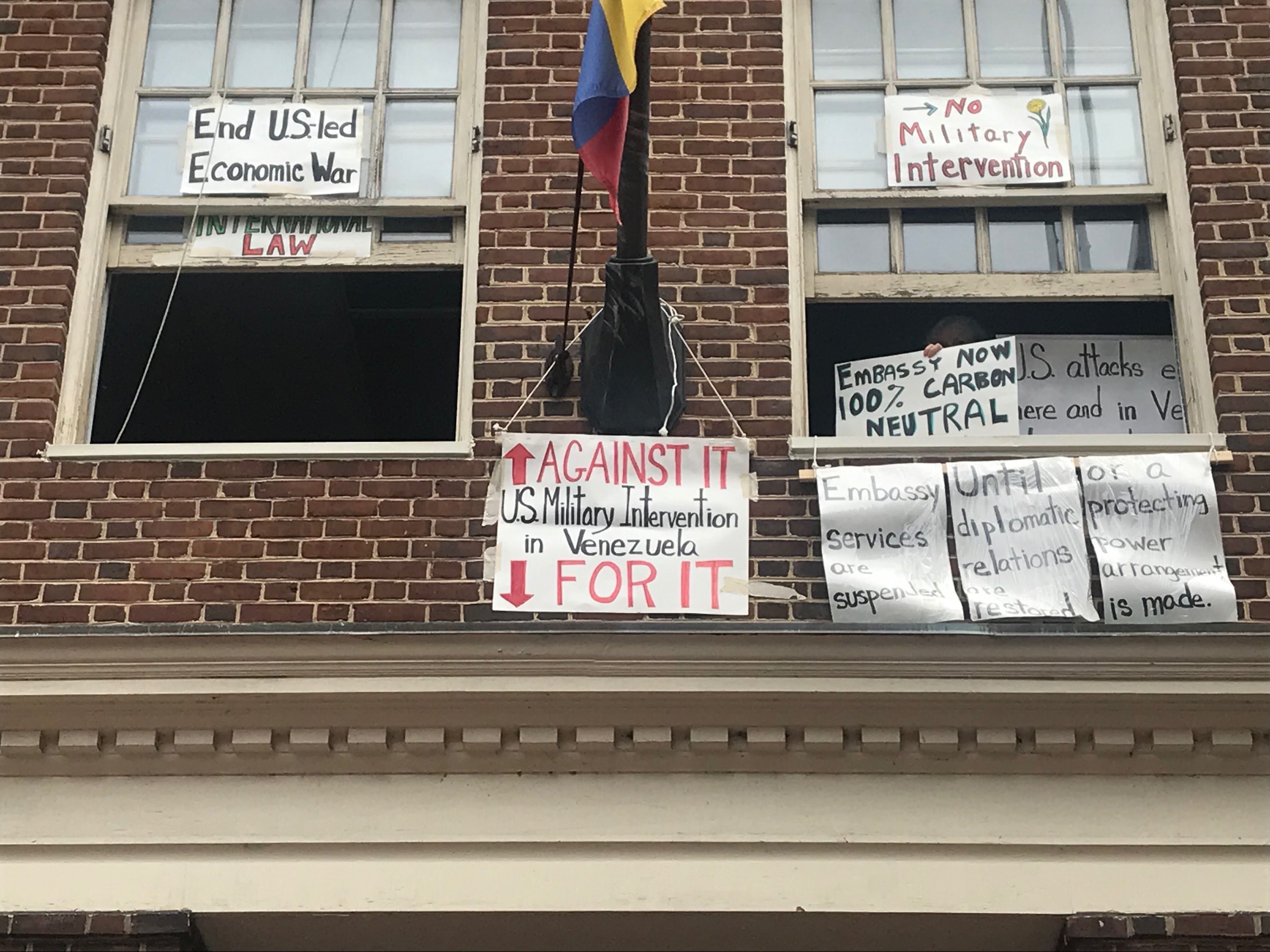 The Venezuelan Embassy, on a normally quiet street in Georgetown, has been the site of major clashes recently between the group of mostly American activists inside and Venezuelan protesters outside. Since April 10, organizers have been living in the embassy 24/7 in an effort to keep diplomats for the country’s opposition government from taking it over. Meanwhile, outside, a group of Venezuelan protesters has set up literal camp, pitching tents and showing up in droves to demand that the activists inside leave the embassy.