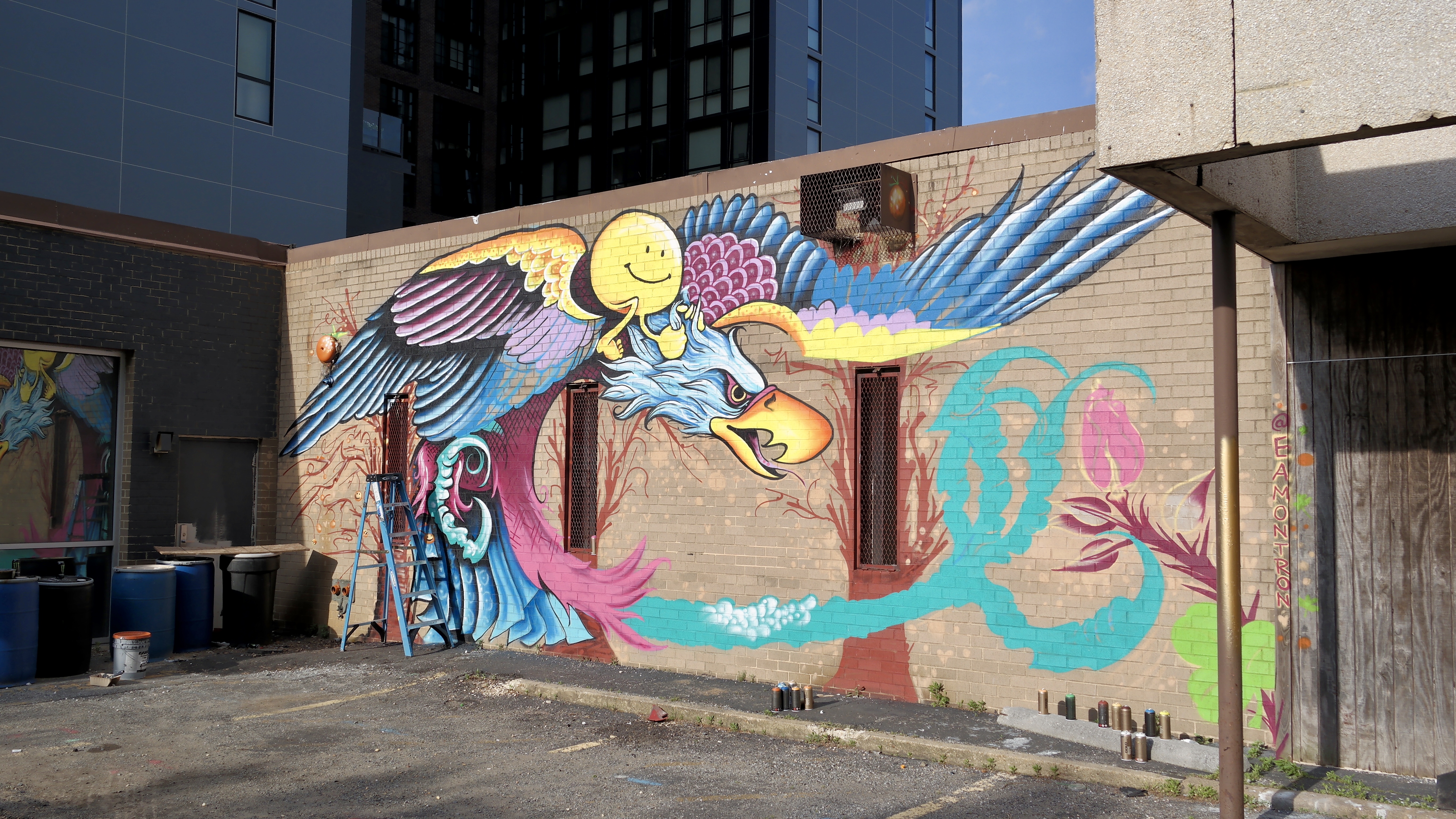 “There’s meaning somewhere, but I’m just going to let people figure it out themselves,” he says of his composition that includes a smiley face riding atop an eagle mid-flight.