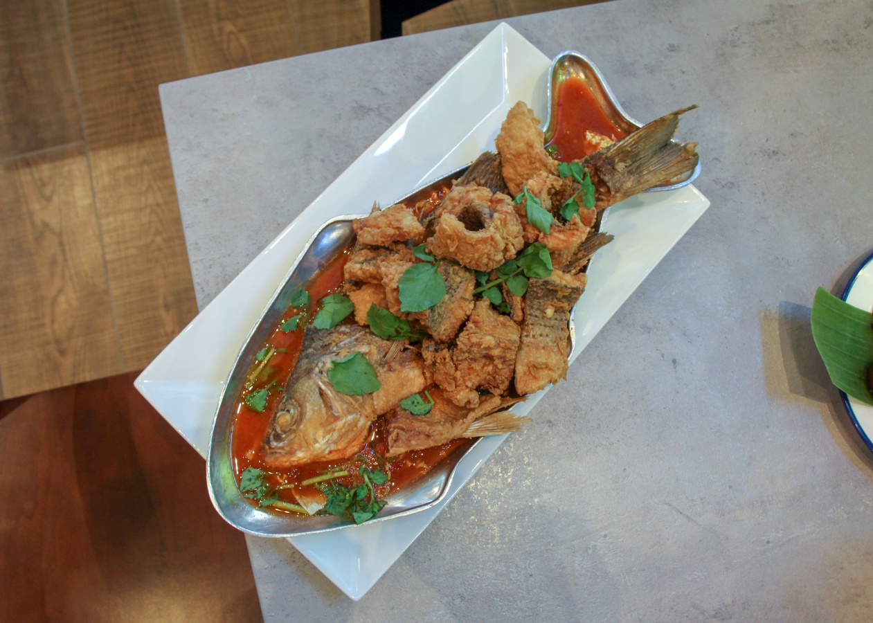 The idea, Ongsangkoon says, is to share the soups, noodle dishes, and meats (or the extensive vegan menu) family style. A whole grilled fish comes belly-up in tamarind and tomato sauces. The herbed pork sausage gets its flavor from house-ground spices and a green chili dipping sauce. Desserts are fruit-forward: mango sticky rice, caramelized banana ice cream.