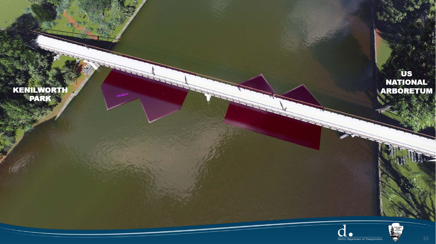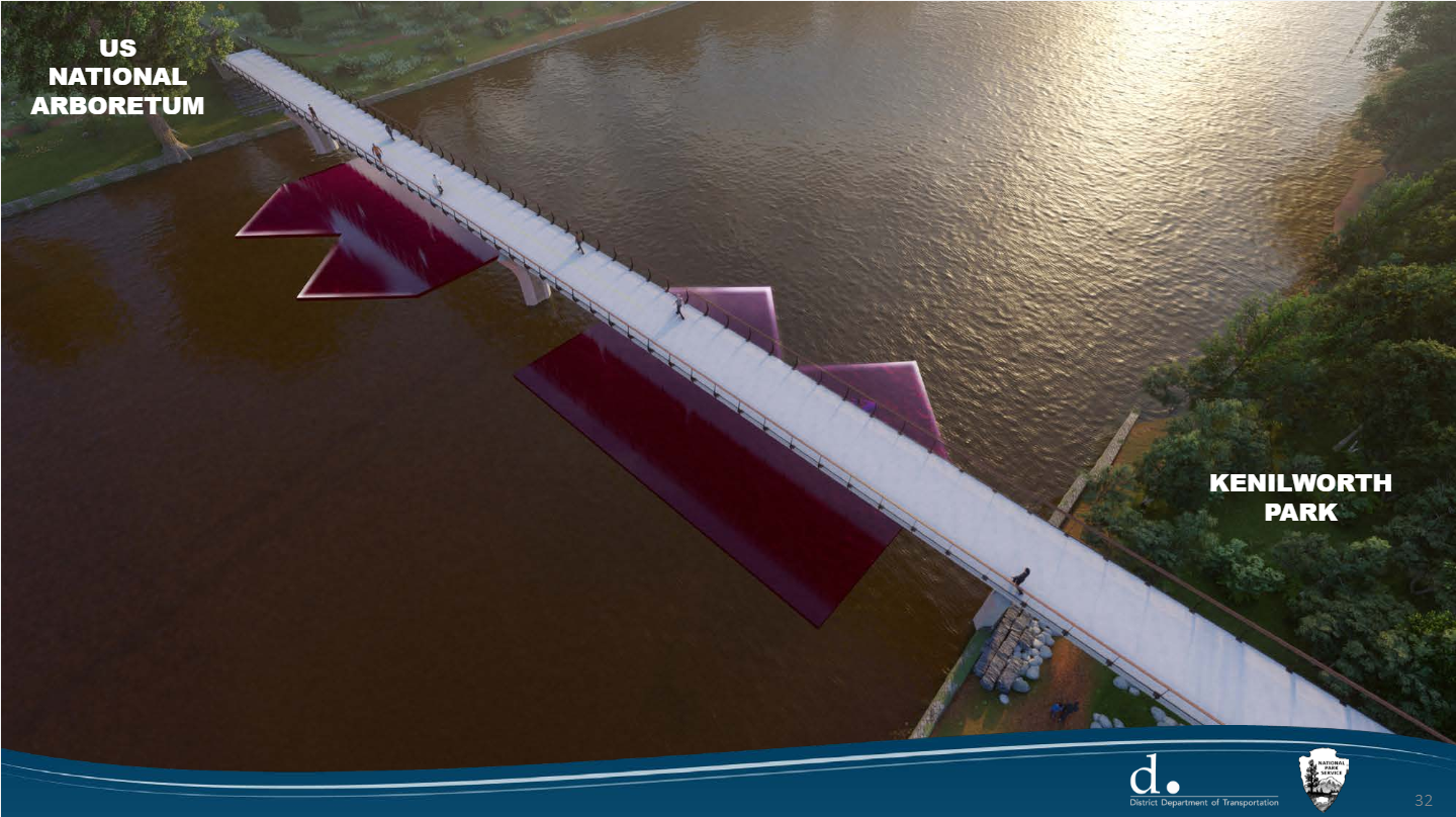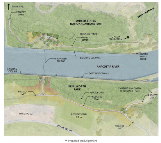 A pedestrian and bicyclist bridge over the Anacostia River has been a long time coming—it is one of 15 projects in the 30-year plan to transform the Anacostia waterfront. The project, situated on National Park Service land, would create a passageway between the Arboretum and Kenilworth Park North, as well as the neighborhoods of Mayfair, Kenilworth Parkside, and River Terrace.
