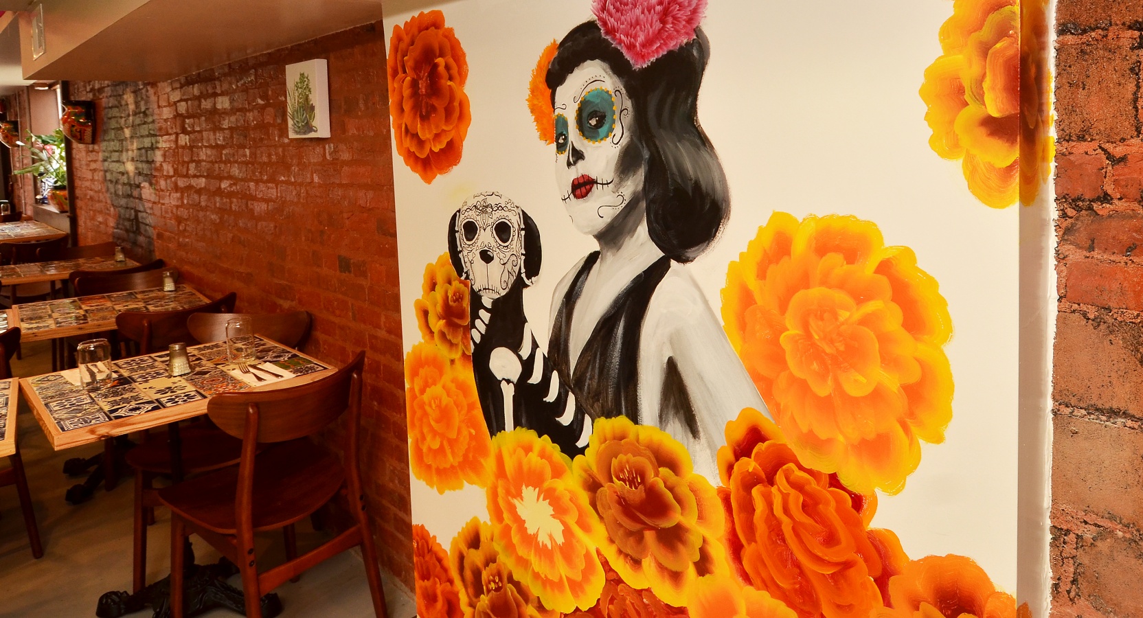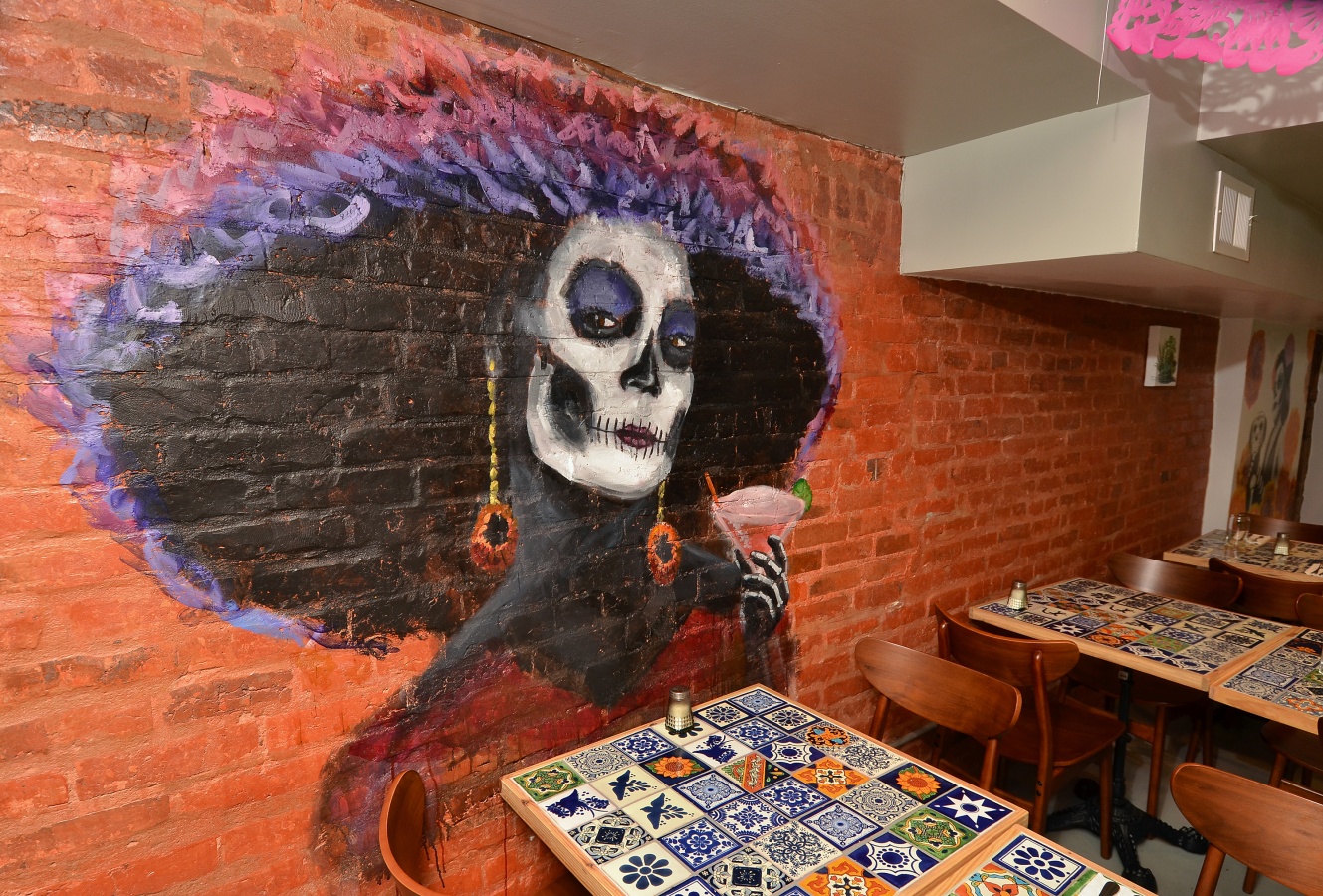 True to the humble heritage of the food, the restaurant’s atmosphere is unassuming, as well. Local artist Justin Stephan created a series of colorful, floral murals in the space, including one of a Catrina, the hat-wearing, popular skeleton symbol of the Day of the Dead.