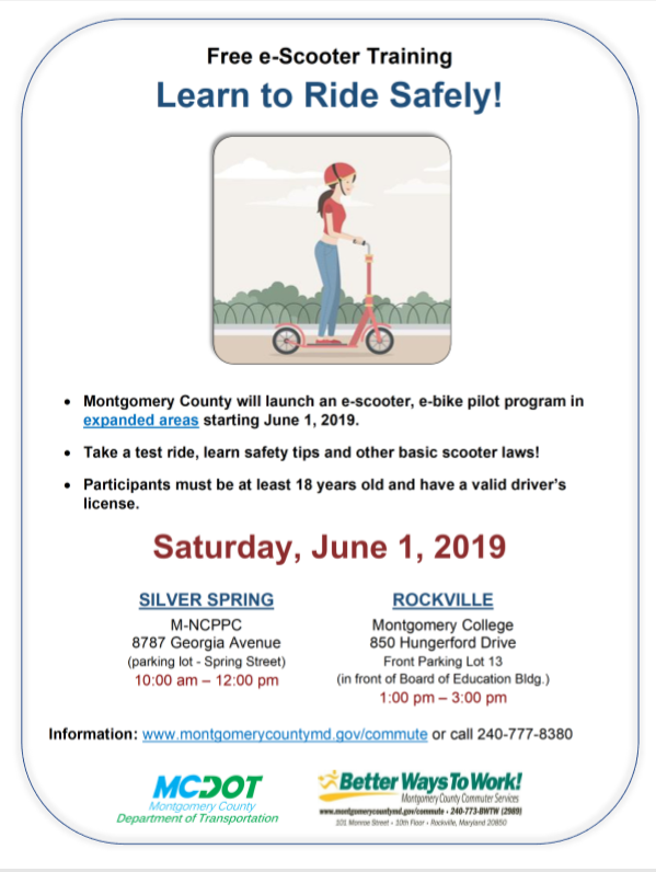 That gave her an idea: a training course to teach people to ride. So as Montgomery County prepares to expand its scooter program to a larger area of the county, they’re hosting two free training sessions on Saturday in Rockville and Silver Spring.