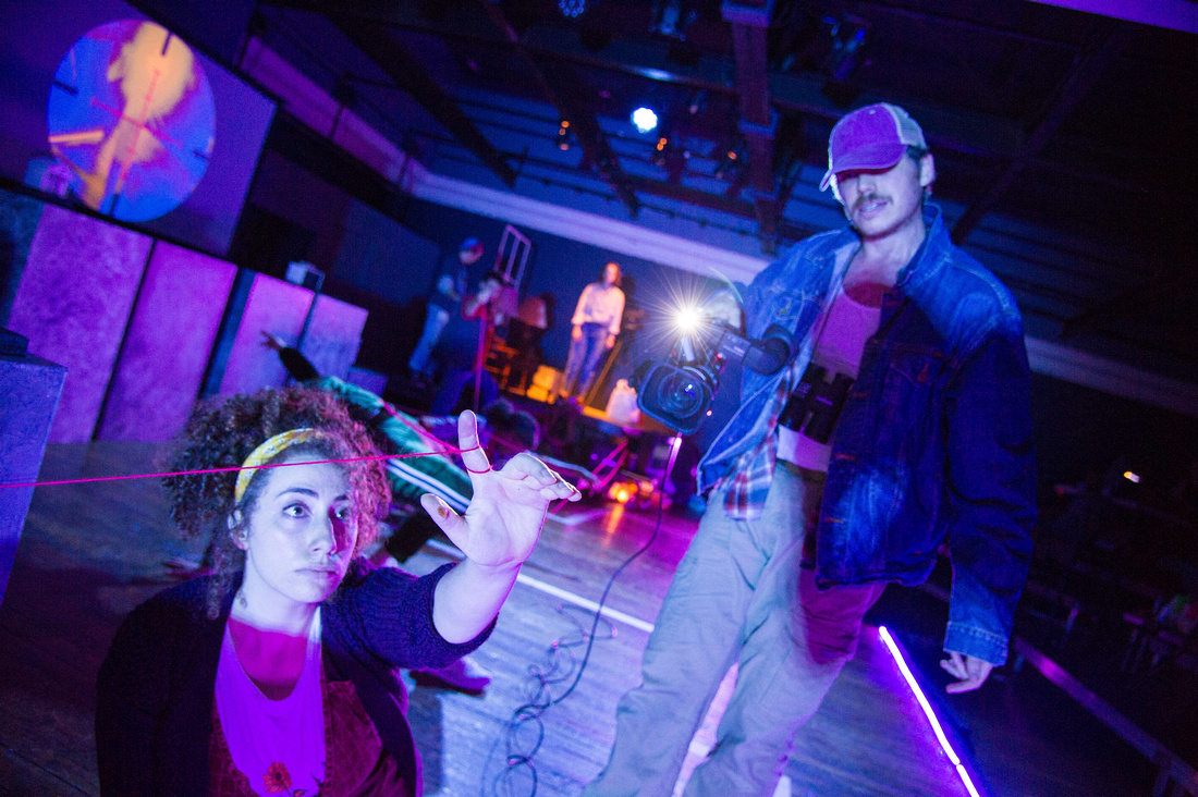 Some of the most creative moments of the production came out of this commitment to co-ownership of the show. The first week of rehearsal was spent playing theater games, something that Colburn first saw as an indulgence. But one warm-up vocal exercise in which the actors create a ‘noise orchestra’, building off of each other with different sounds, turned into a poignant moment in the show: As Mr Chyll flips through channels, the actors turn on and off their voices, creating a ‘noise orchestra’ of the news as they relay the breaking story in various pitches of hysteria.