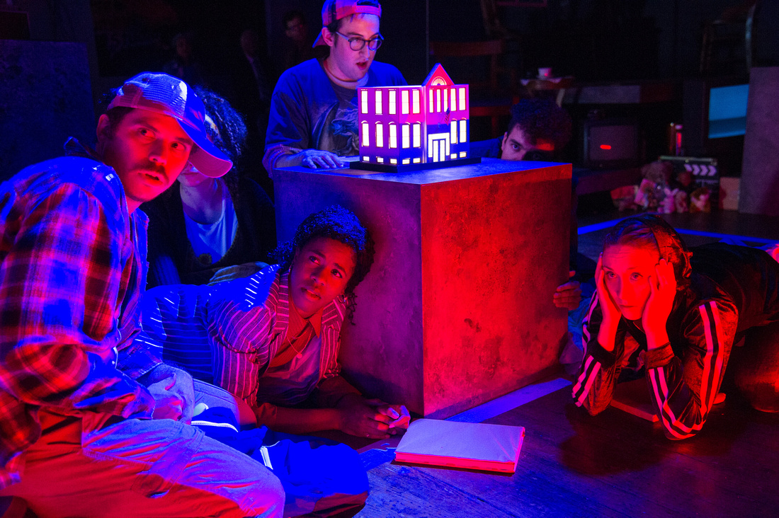 Outside of these moments of assault, though, Forest Treás is more of a sensory playground, a town that exudes a Pleasantville-style sense of fragile perfection and curiosity. Designers Grace Guarniere and Emily Lotz built a series of miniature, stark-white replicas of the town’s landmarks, from Pop’s gas station to people’s homes, that sit on elevated platforms onstage. The characters interact with these miniatures throughout the show, sometimes huddling around them to peek in the tiny windows as if out-of-body is the only way to make sense of the recent events of their lives. The TV screens placed across the stage project the view from a video camera, held by different characters throughout the production as they cast the news, interview each other, and magnify the miniatures on-screen.