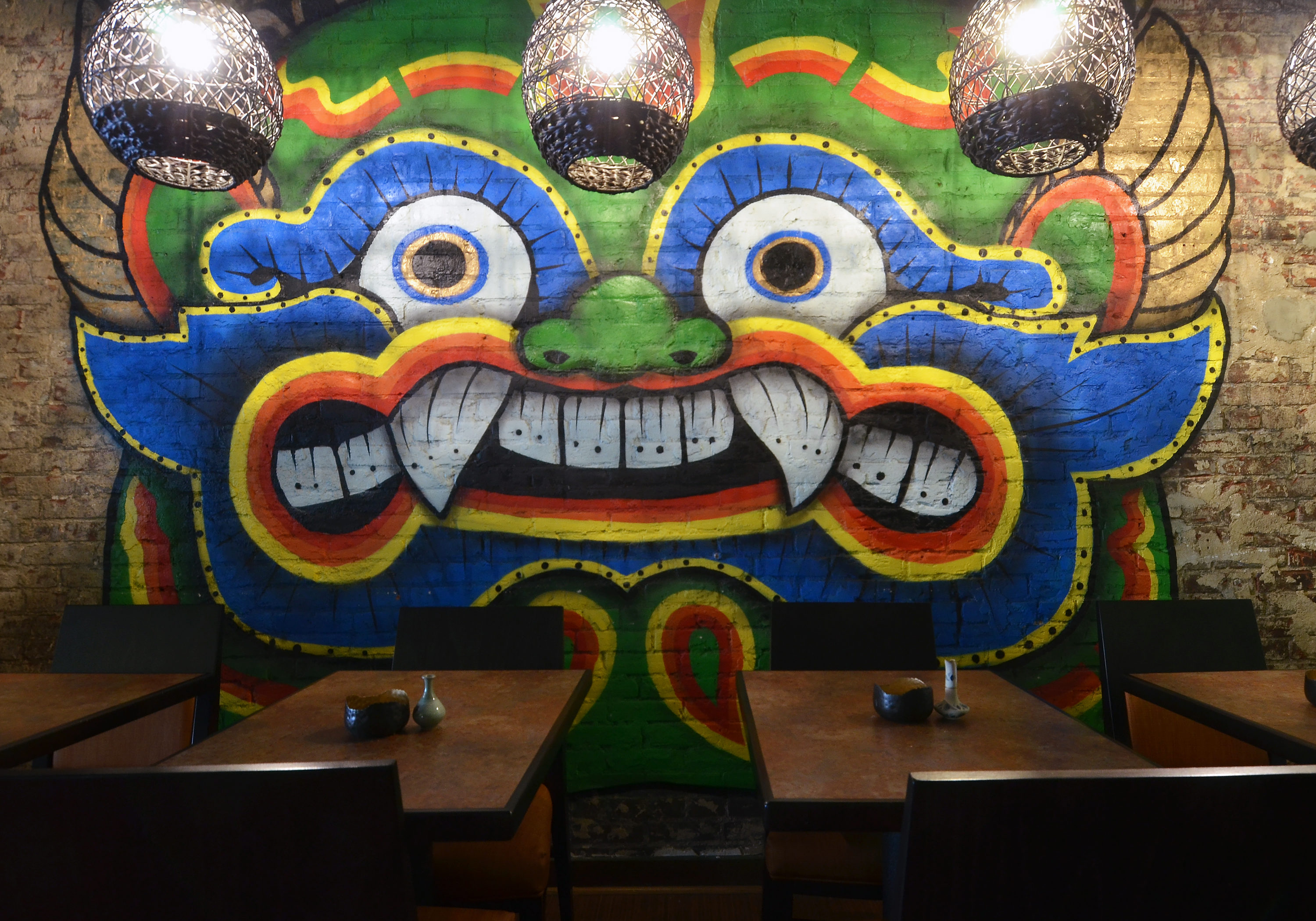 A cozy space, Hanumanh is worlds away from its 7th Street neighbor Dacha. The exposed-brick walls sport an enormous, vibrantly colored mural of the eponymous monkey king. He lords over the space and its 30 seats, half of which crowd around the bar and its trendy copper cocktail gadgets.