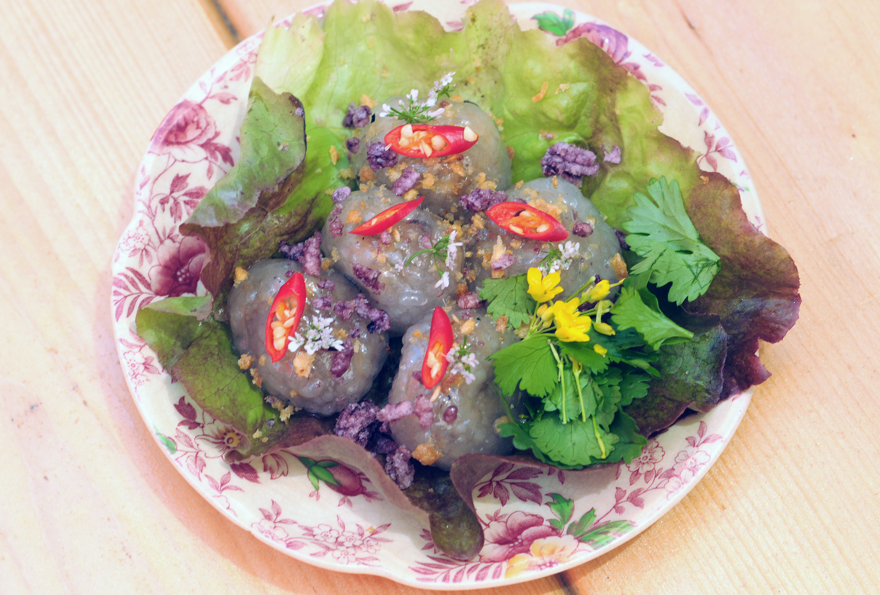 The menu is divided into appetizers, salads, and curries. One top-spot snack is sakoo yadsai, or tapioca dumplings. Pradachith melts salted radish, pork, and peanuts into a palm-sugar caramel as the filling. The dumplings are coated in puffed rice and fried garlic, and topped with sliced chilies and chrysanthemum leaves.
