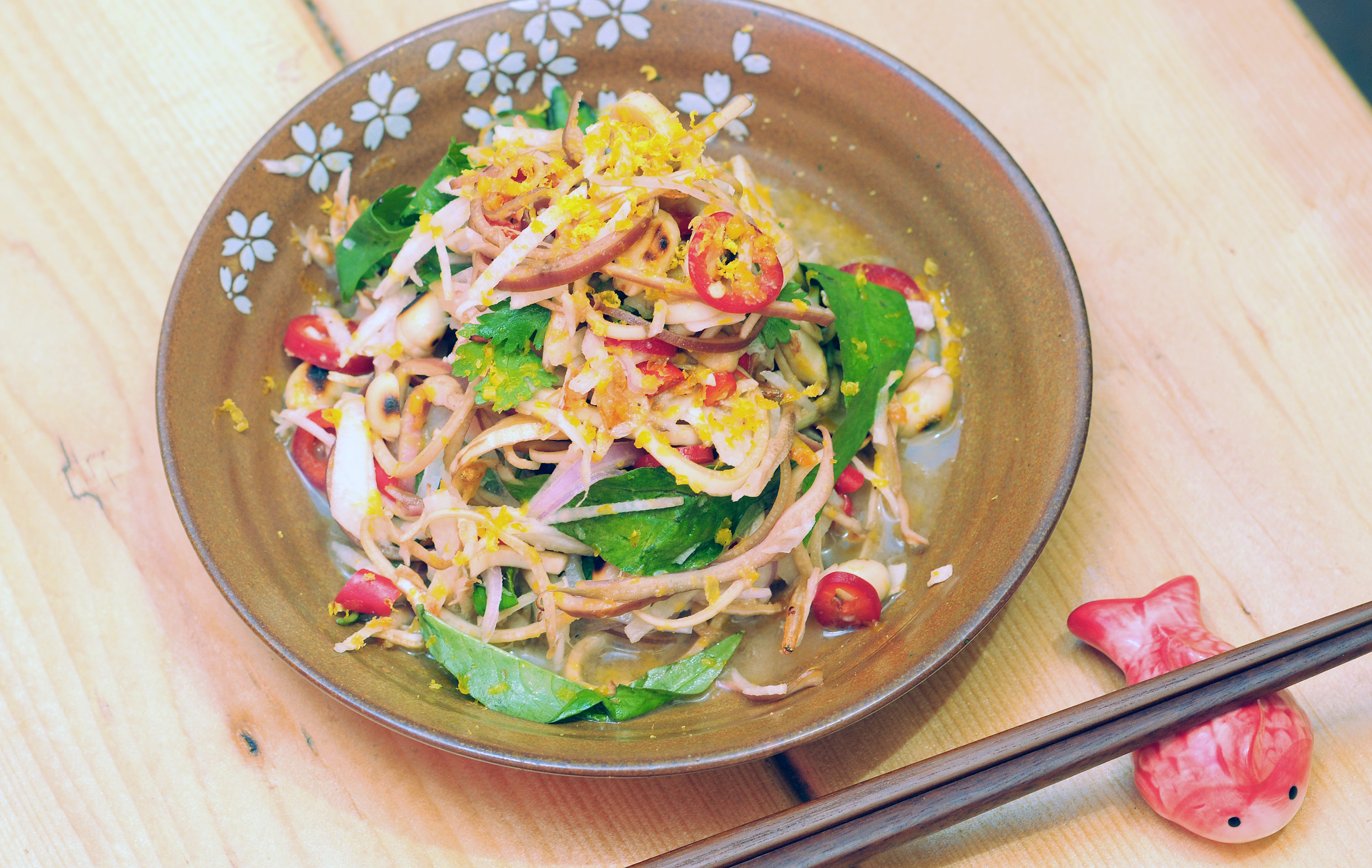 Another is the shaved banana blossom salad, made from the flower of the banana plant. With no resemblance to the starchy, sweet fruit itself, the blossom acts more like an artichoke, floral and bitter. The kitchen slices it thin and mixes it with jicama, toasted peanuts, and dried baby shrimp, tossed in a tropical-tangy tamarind-coconut fish sauce. It’s topped with fried shallots and salt-and-sugar-cured egg yolk shavings. The salad is a cousin of the ubiquitous papaya salad found in Southeast Asian night markets, but stands out with its use of the banana leaf, so infrequently found in the U.S.