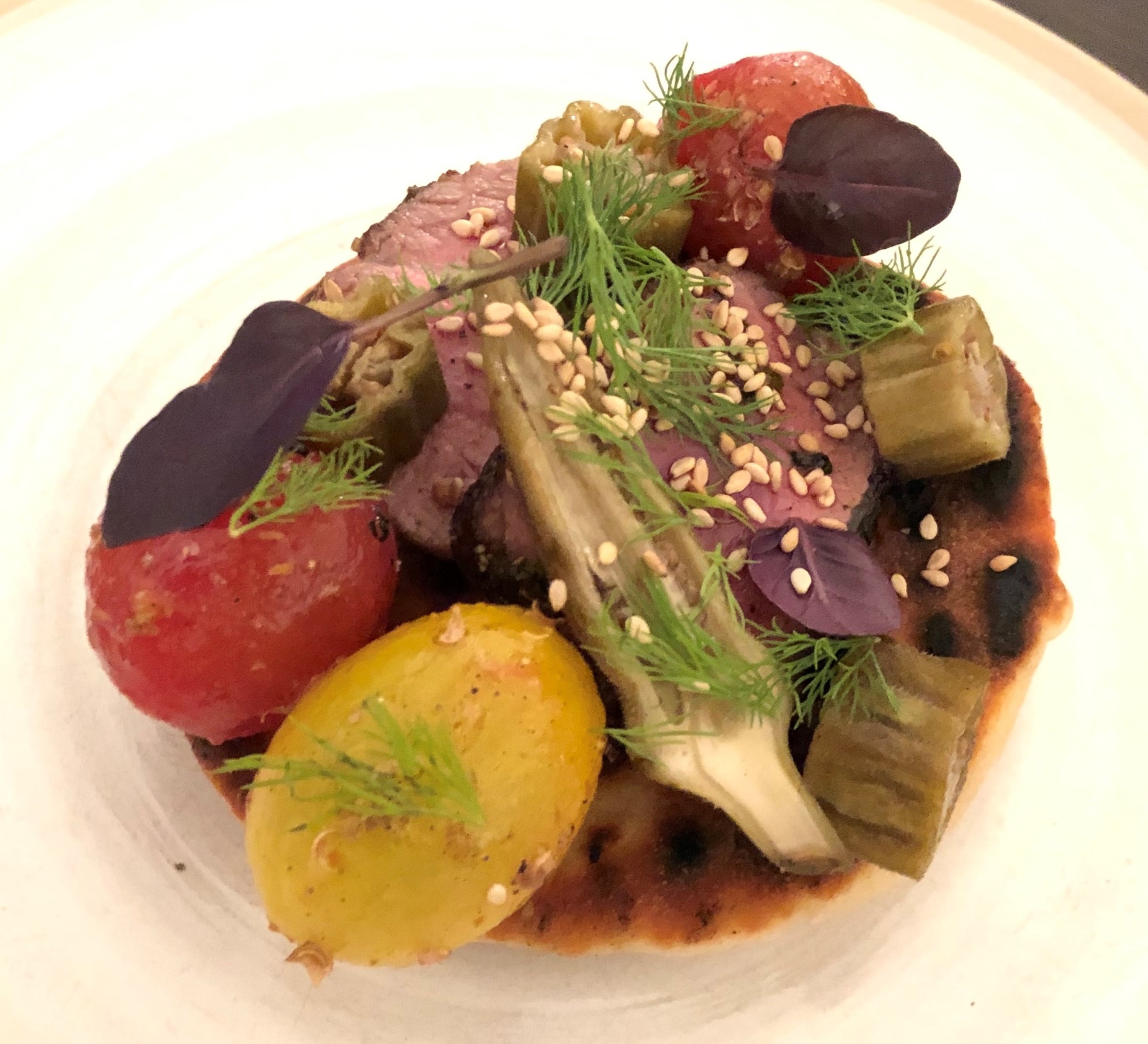 “Bamia is traditionally a stew with lamb. And so, we have a little lamb loin on top that we grilled with cardamom and coriander, and a little charred onion relish that we kind of lacquered it with as it cooks,” he says describing the colorful and savory plate.
