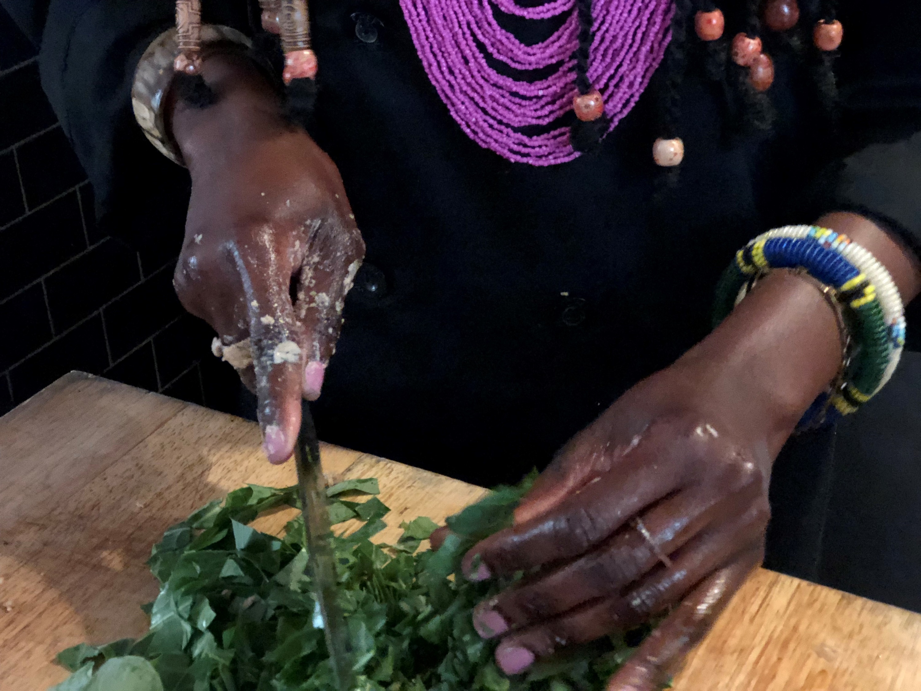 Apollo chops collard greens for use in her dish, basico. Her hands are sticky with a paste made of ground sesame seeds, also an ingredient in basico.WAMU / Esther Ciammachilli