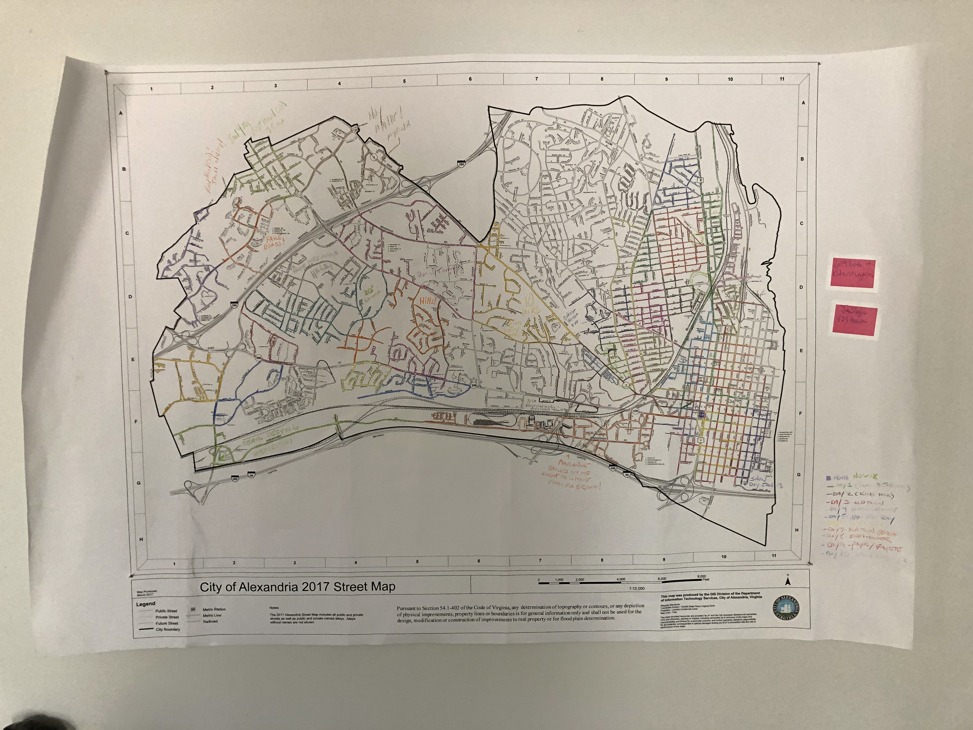 “I was just in a running funk, and this was inspiring and a new way to knock out some miles,” Lasure says. Sharing her progress on social media and marking it on a large city map on the wall of her Old Town apartment, she has covered about three-quarters of the city, or nearly 260 miles. This includes the length of King Street, much of Old Town, and many of the city’s outer car-oriented environs near Interstate 395 and Van Dorn Street.