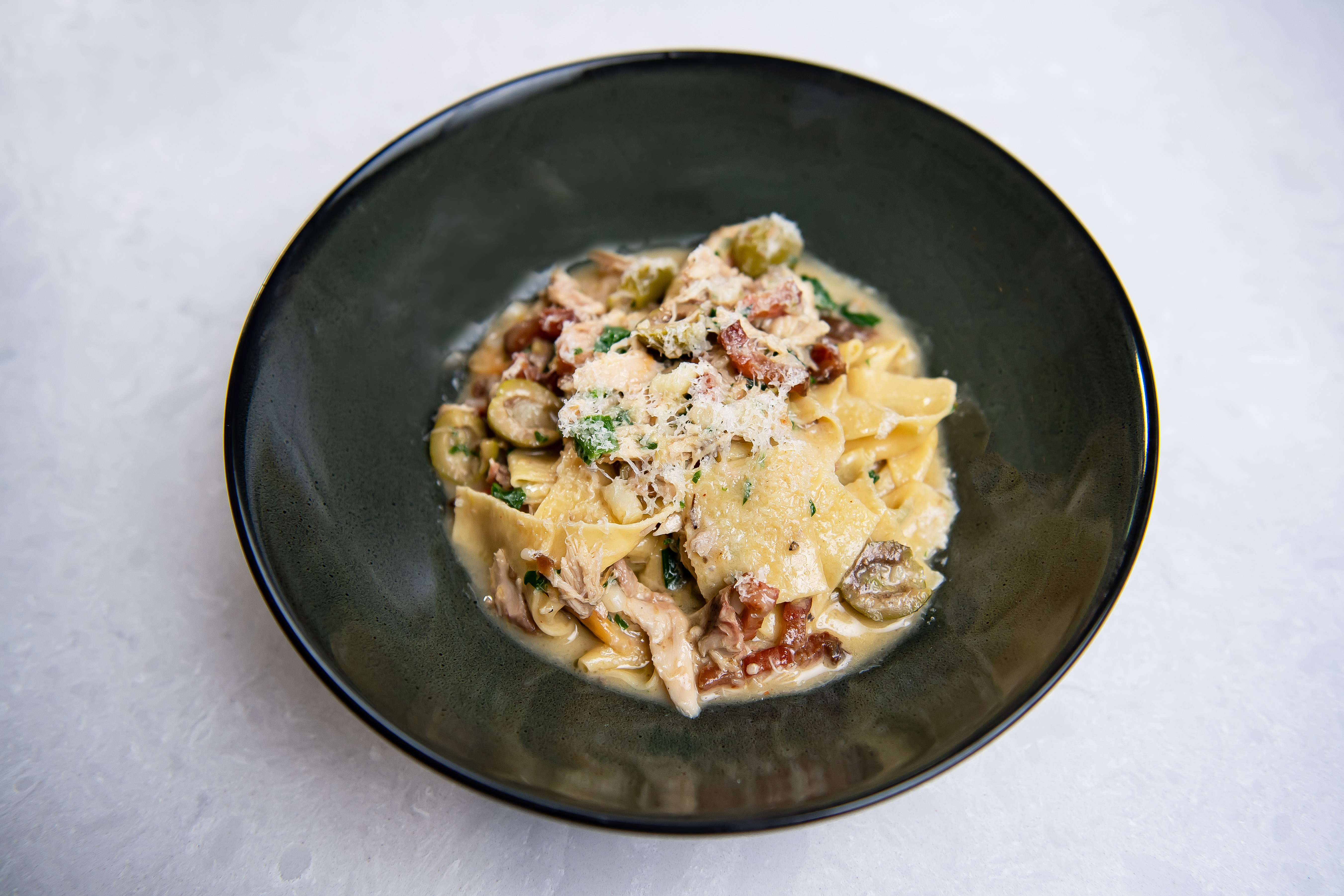 Italy, too, makes good use of rabbit. At recently-opened Via Sophia downtown, executive chef Colin Clark crafts a pappardelle pasta ($32) with braised rabbit ragu. Instead of using chicken as a complement as in the paella or the mousse, “my rabbit pappardelle starts out with pancetta crisped in a pan, which lends texture and salinity to the dish,” Clark explains. Sautéed garlic and baby shallots add flavor, while green Castelvetrano olives provide a subtle richness. Gossamer-thin gratings of four-month-aged Pecorino Toscano cheese finish the creation.
