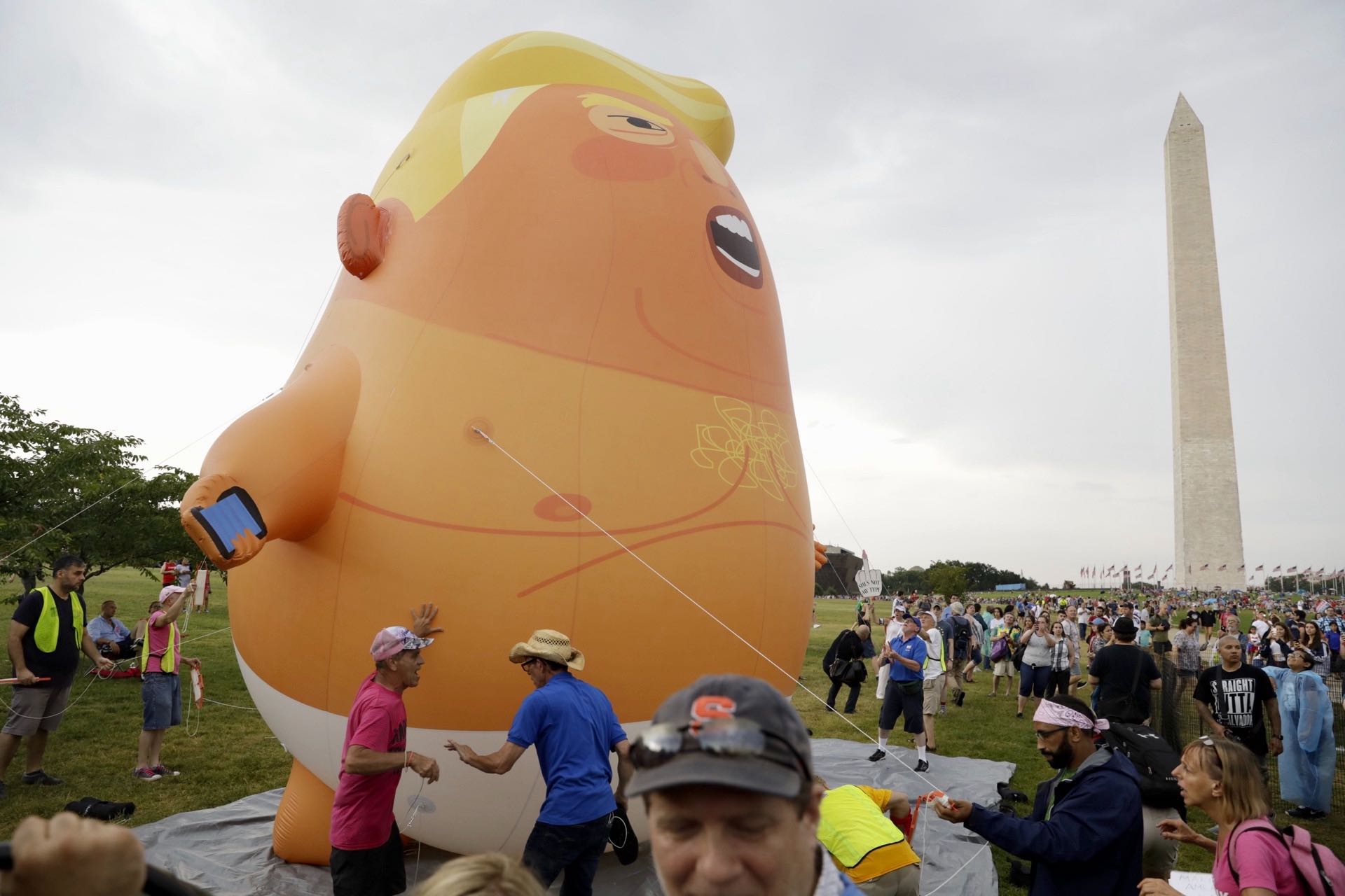 - DID THE TRUMP BALLOONS STAY GROUNDED?: The giant baby Trump balloon remained on the ground, per National Park Service rules. At one point, in the midst of the rain, it was deflated, before protesters re-inflated it.