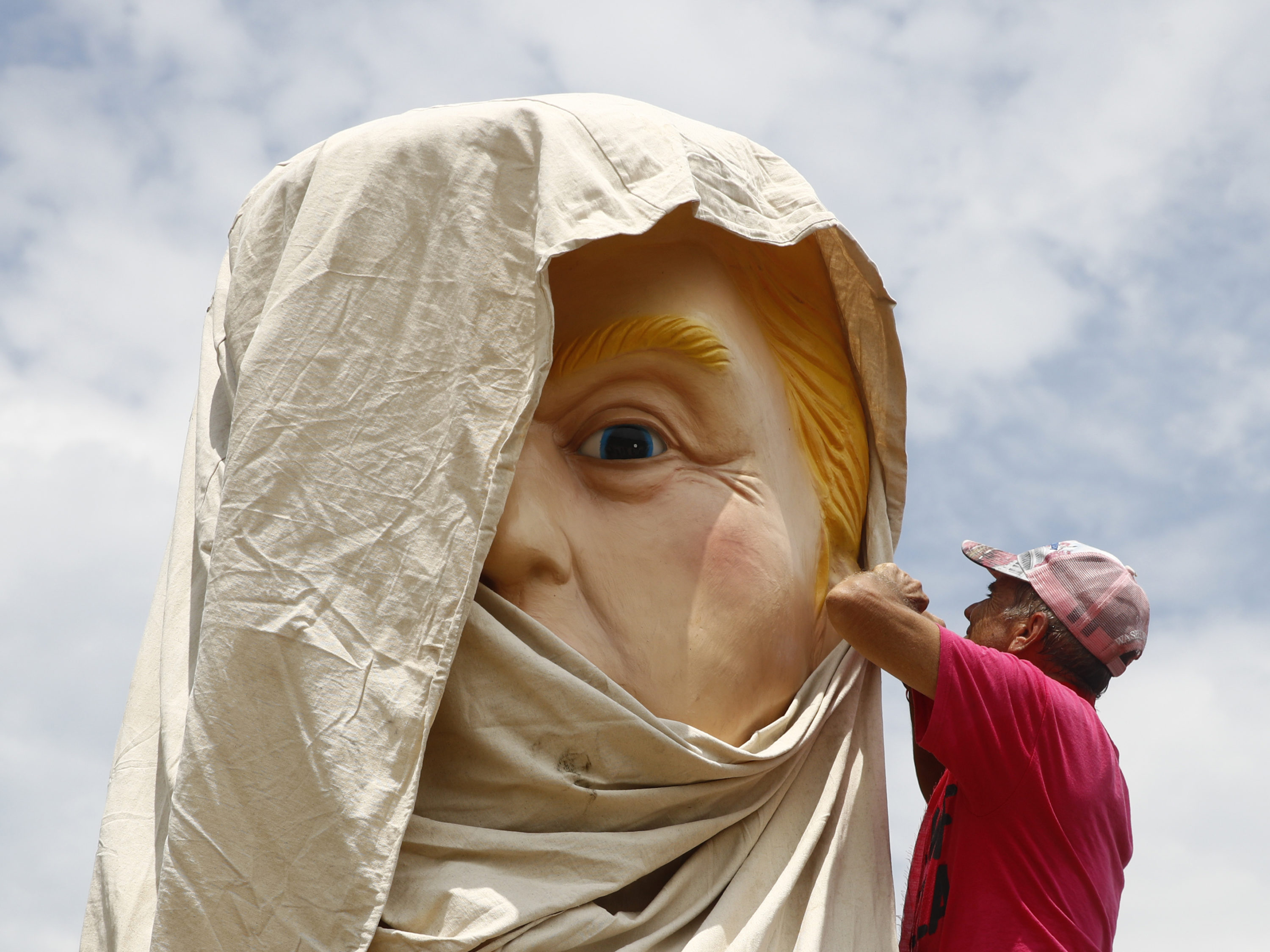 The spectacle also includes an 16-foot sculpture of a scowling, Maga-hat-wearing Trump tweeting with his pants down on a golden toilet.