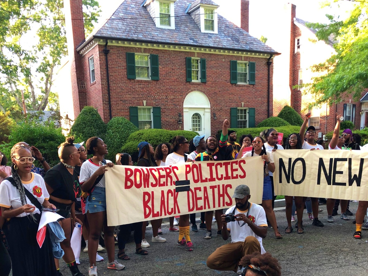 Dozens of activists gathered in protest outside the upper Northwest home of Mayor Muriel Bowser on Saturday, chanting “bounce Bowser” and “shame.” A large banner summarized their opposition to a number of the mayor’s positions, reading “Bowser’s policies = black deaths.”