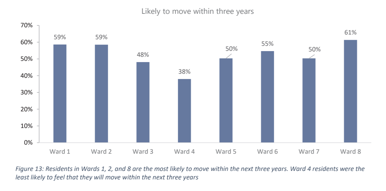 The report also sheds light on just how many Washingtonians believe they’ll move, for any reason. A majority of people in every ward, except 3 and 4, said they are likely to move over the next three years.