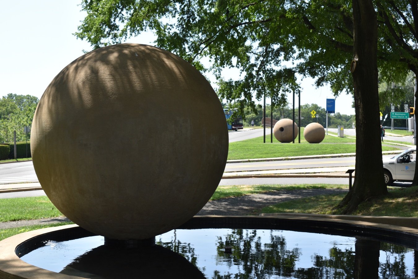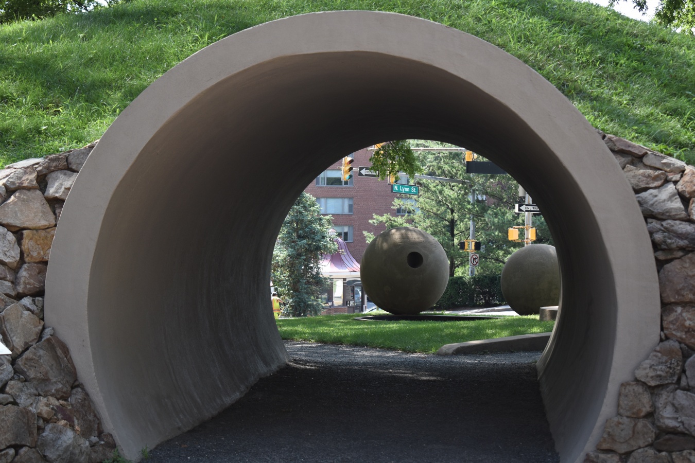 Her vision included a great deal of very deliberate symbolism. The two spheres and steel rods located across the intersection in between North Lynn Street and Fort Myer Drive were designed so that only on each August 1 at 9:32 a.m., the shadows cast by the spheres would line up directly with the metal shapes on the ground. She chose August 1 because it’s the date in 1860 when William Ross acquired the land that became Rosslyn. As for why 9:32 a.m., Holt simply liked the shadows at that particular time.