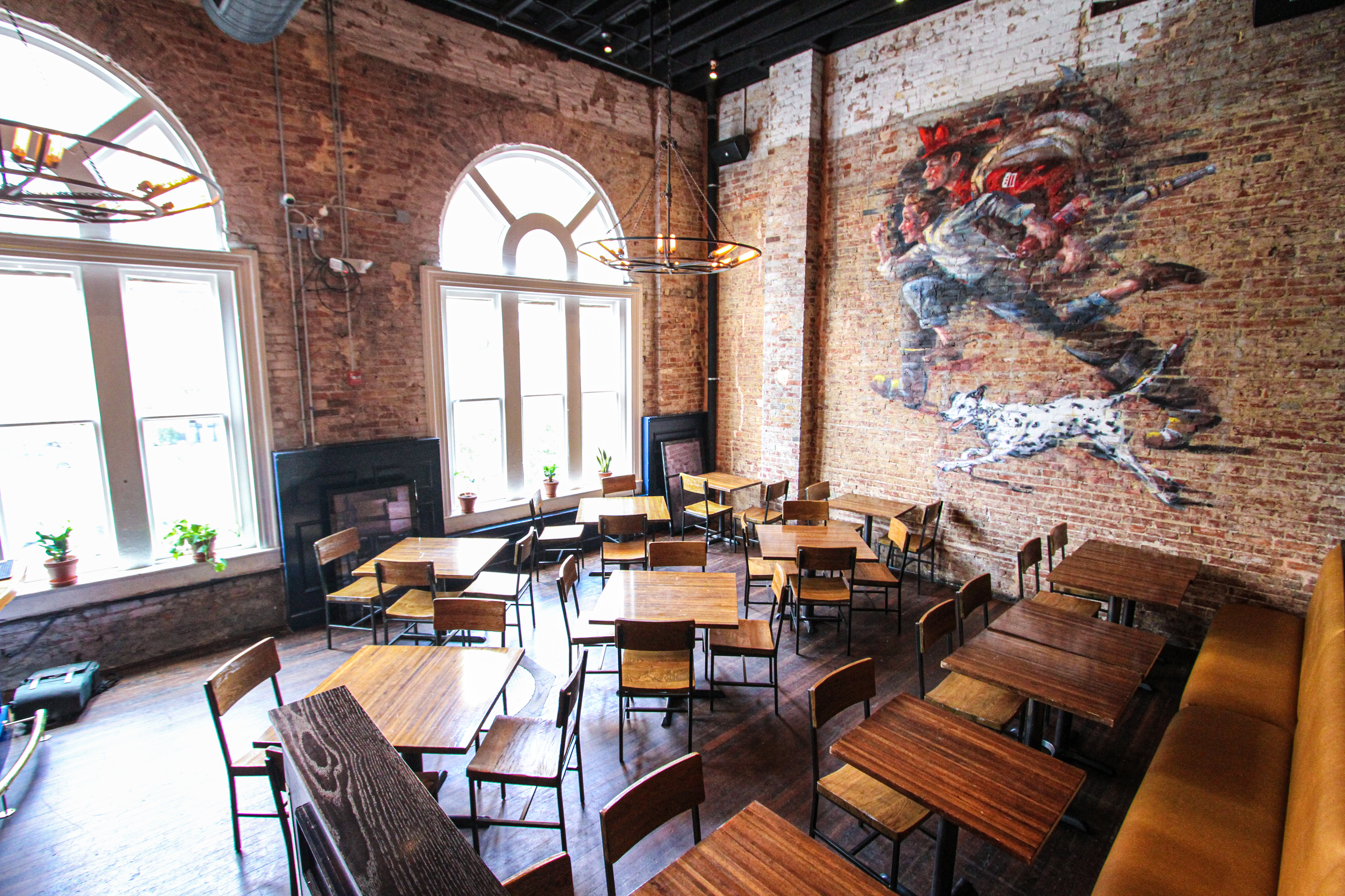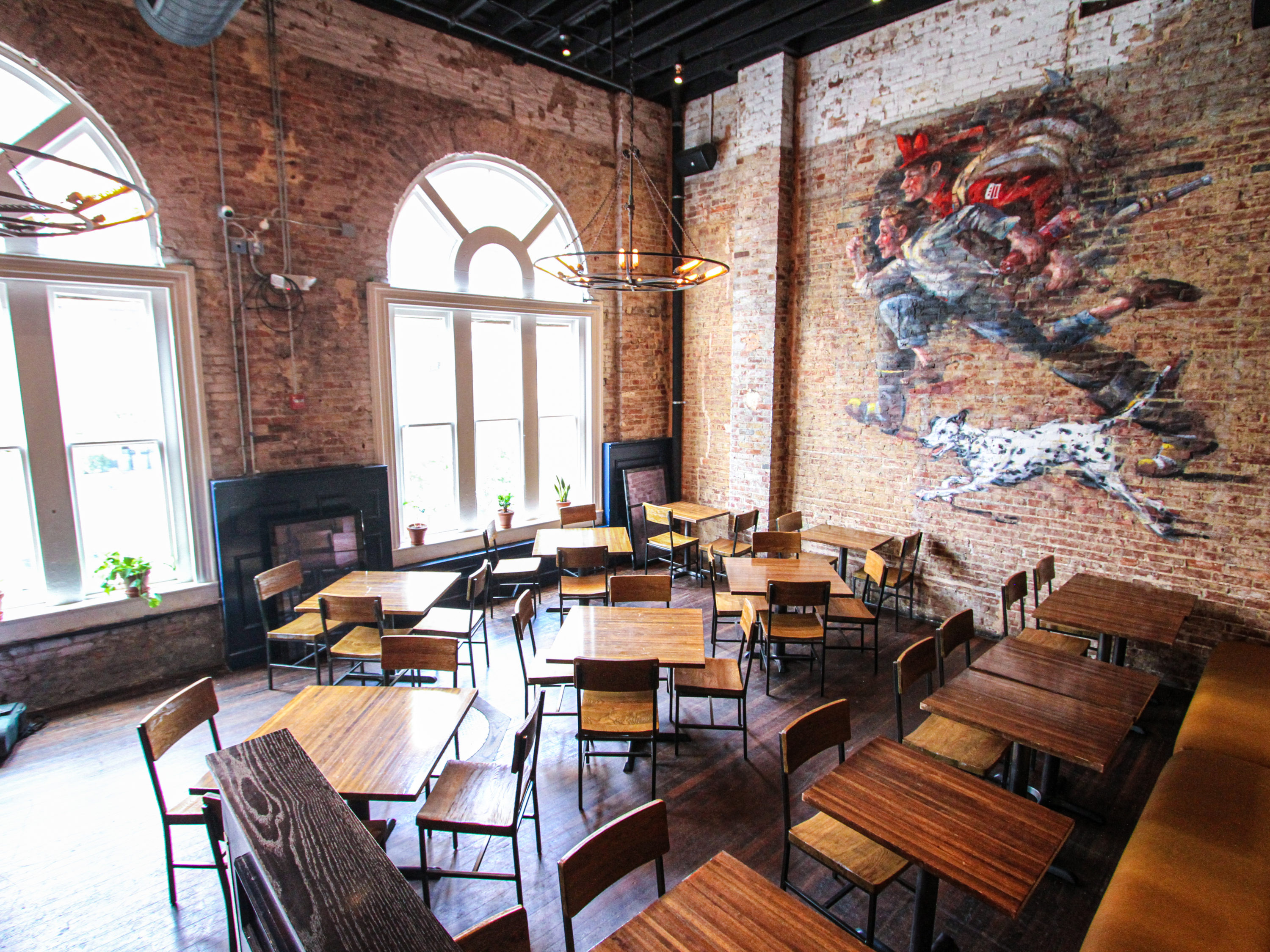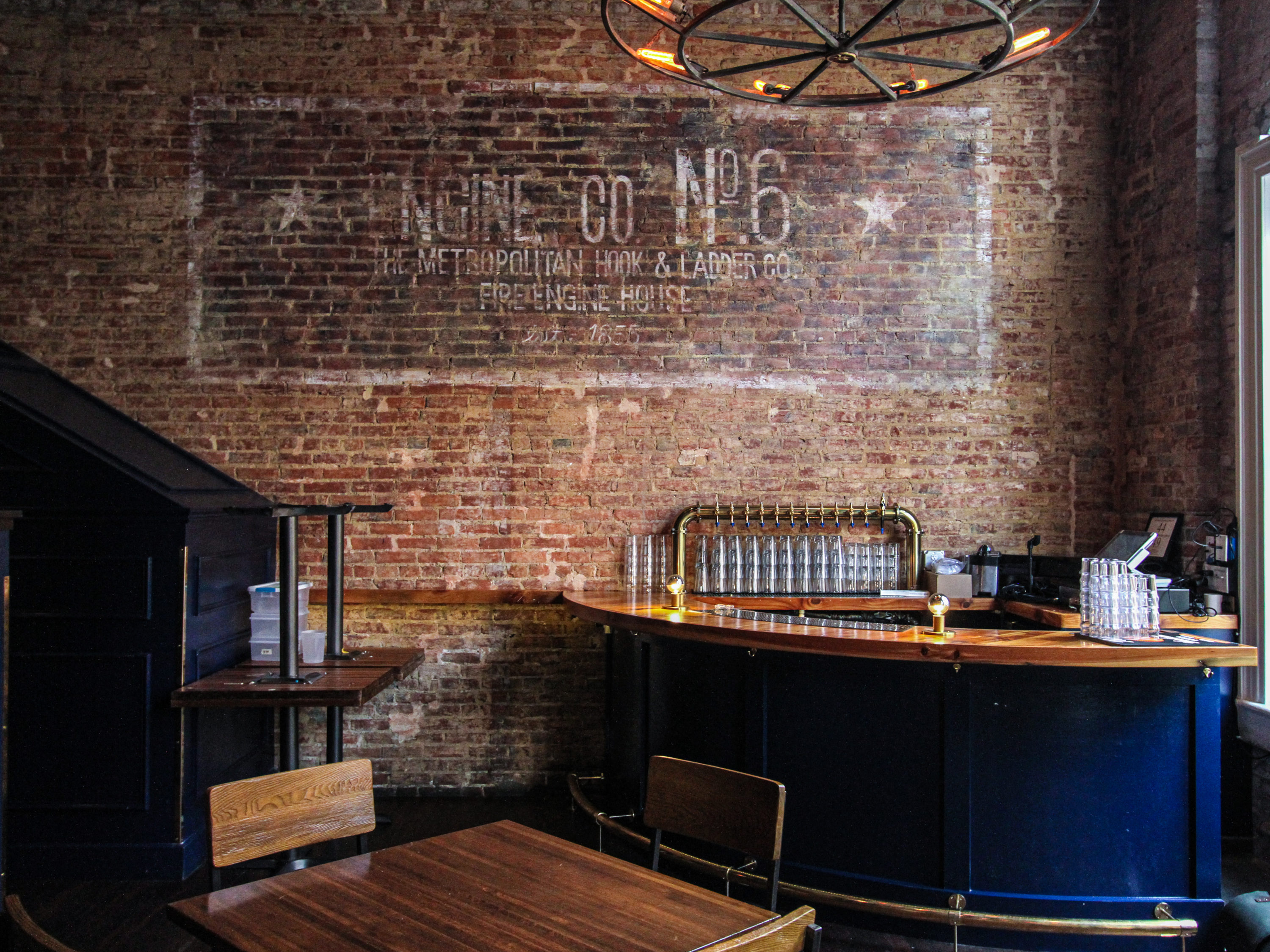 If you look closely, you’ll spot nods to the building’s firehouse history. Pieces of fire ladders separate the booths, fireman’s poles make up the foot rails, and the wall next to the bathrooms is covered with fire hoses like a sort of 3D wallpaper. Other touches are more subtle. Look up, and you can see the spots where the fireman’s poles used to be situated. They also dug up a steel plate in what used to be the stables (the fire truck-pulling horses would kick at it). You can see it now behind the bar.