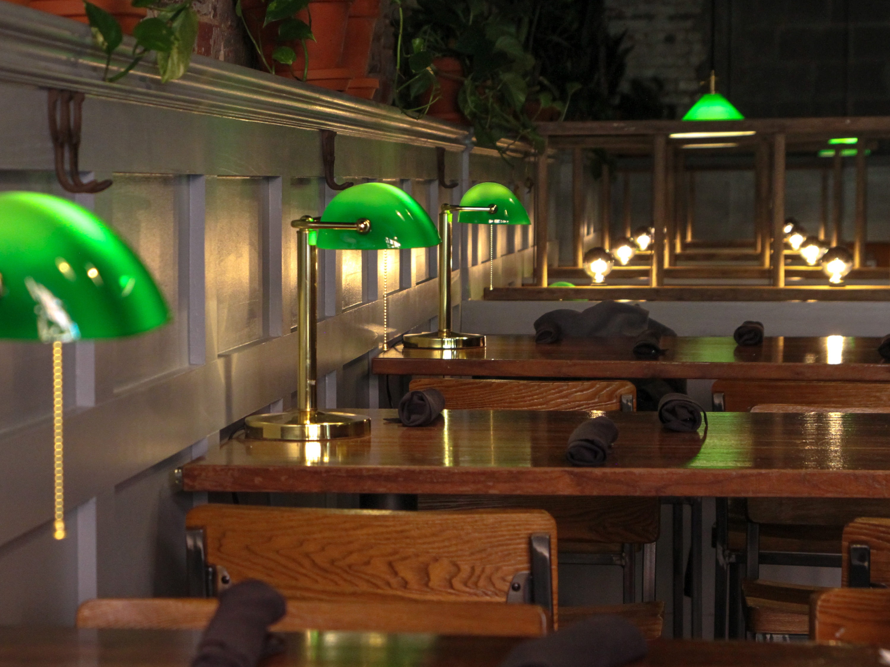 He added some touches to brighten up the space, too, like green desk lamps at the tables and hanging overhead. “I’m wondering if people in D.C. who work at a law firm or at a place that has banker lights at their jobs are going to dislike them because they remind them of work,” says Bernel, who says he selected them because his dad had one just like them on his desk.