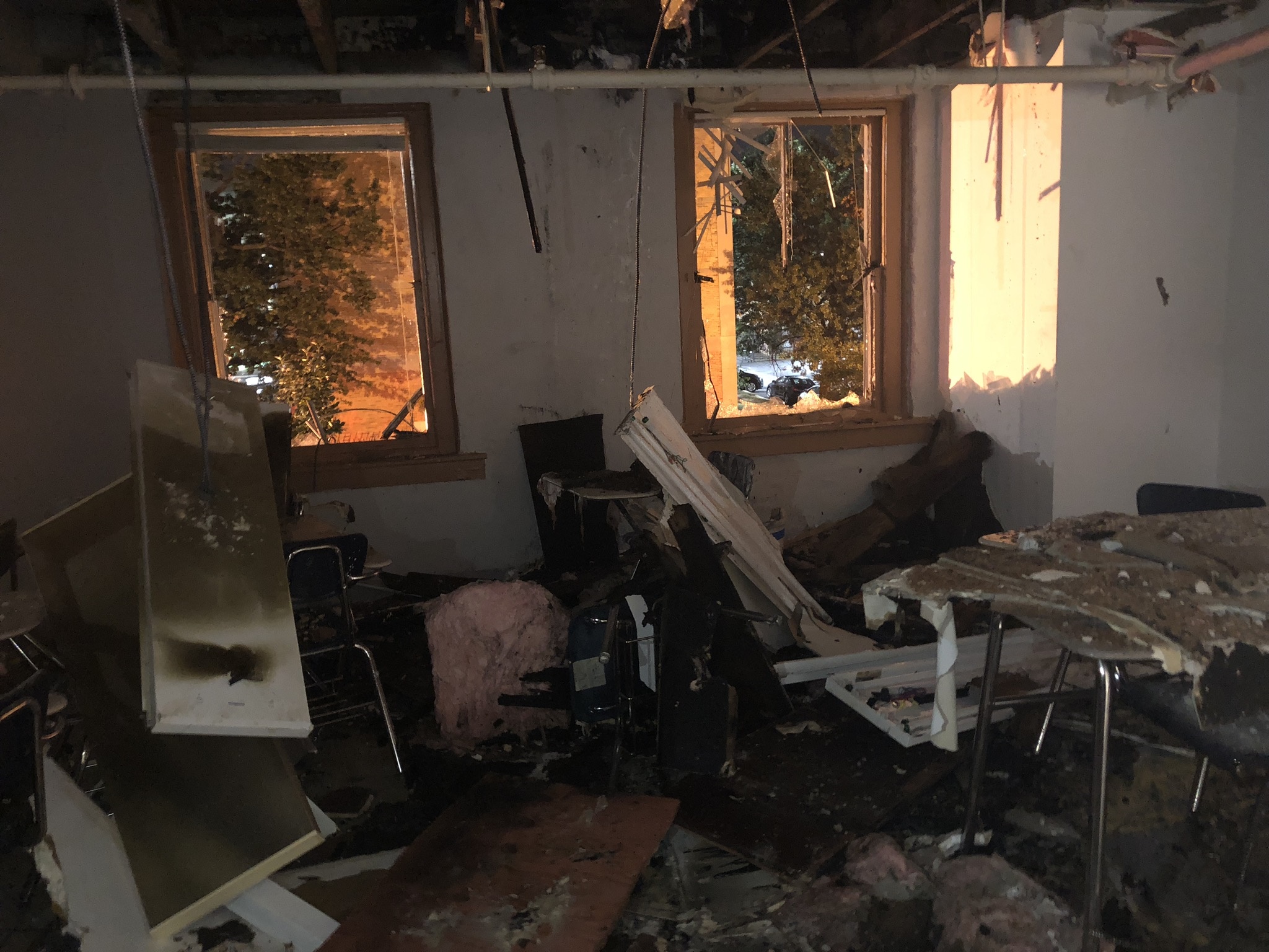 Firefighters were dispatched to the school at about 10:30 p.m., and they were able to contain the blaze before it spread throughout the building. Only one second floor classroom was damaged on the interior of the building, Maggiolo says. No one was injured in the fire.
