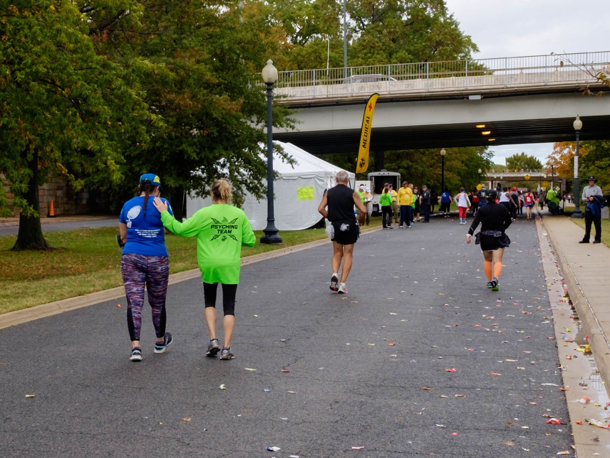 Psyching team members also helped coach people through the disappointment that comes with needing to drop out of the race, or discovering they wouldn’t make the dreaded time cutoffs. Runners must make it through three gauntlets—one at Independence Ave. and 15th St., another in Crystal City, and a third across the 14th Street Bridge—by specific times, or they won’t be recognized as official finishers. That means they must maintain a pace of 14 minutes per mile.