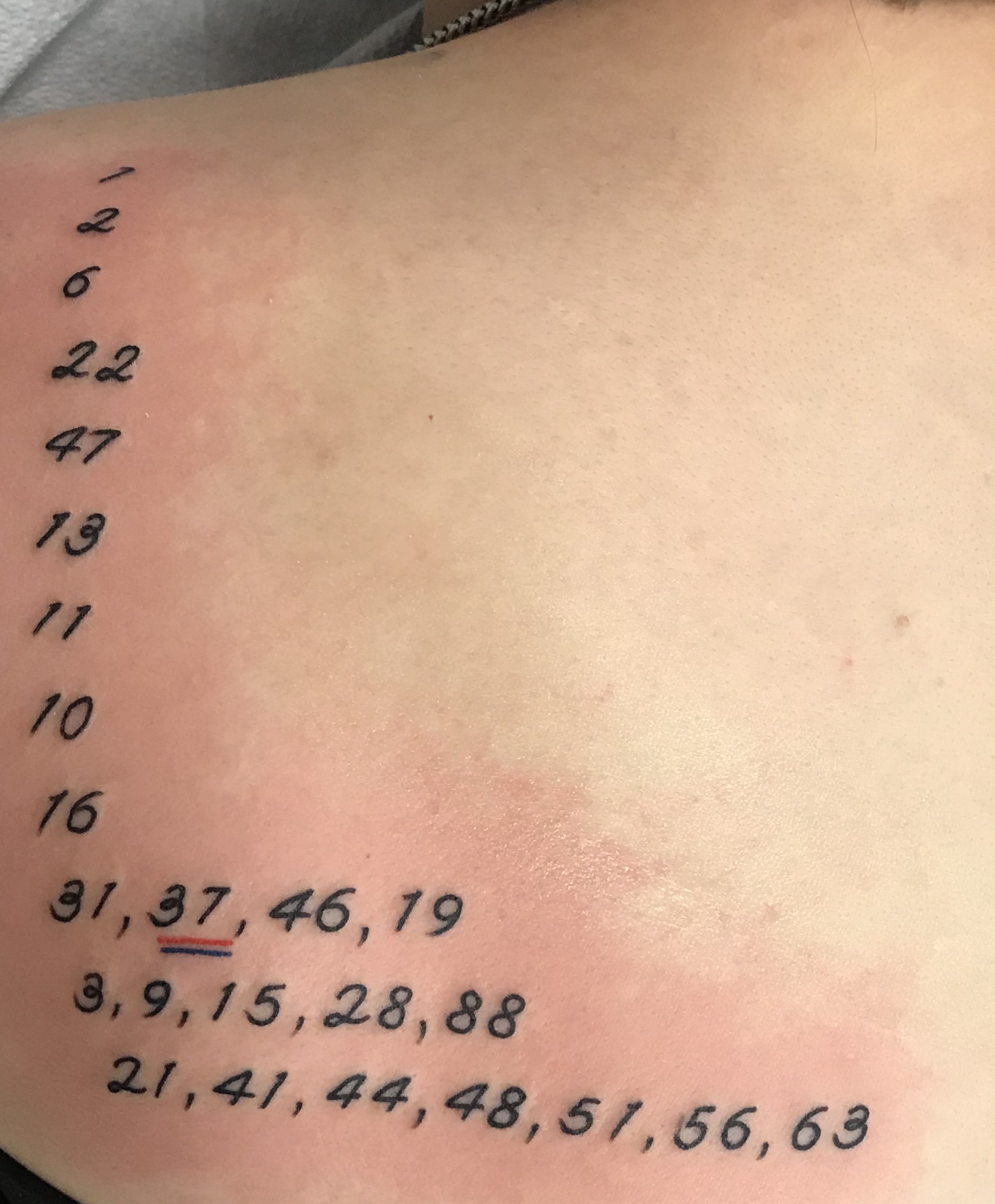 Yanover got the entire Nats World Series 25-man roster numbers tattooed on her upper left shoulder – starting with the batting order from Game 7, as well as the four starting pitchers, the bench players, and relievers. “I get really sentimental. Like really sentimental,” Yanover said, “and this team was really special.” Although it’s not her first tattoo, it is her first “sportscentric” one, she said.