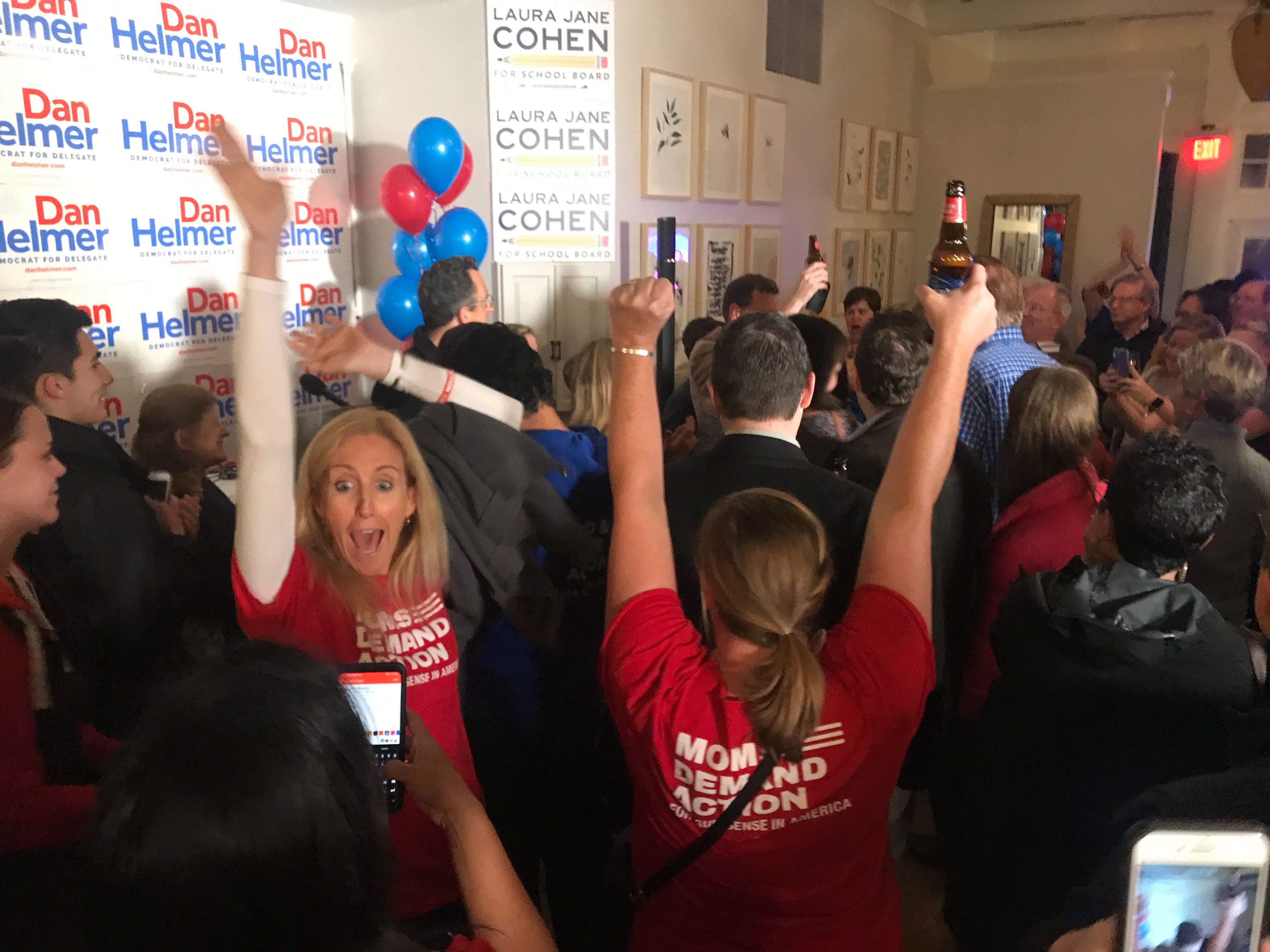 Kim Perks, left, reacts as the race was called for Democrat Dan Helmer. Helmer defeated incumbent Tim Hugo — the last Republican left representing Fairfax County in the state house.